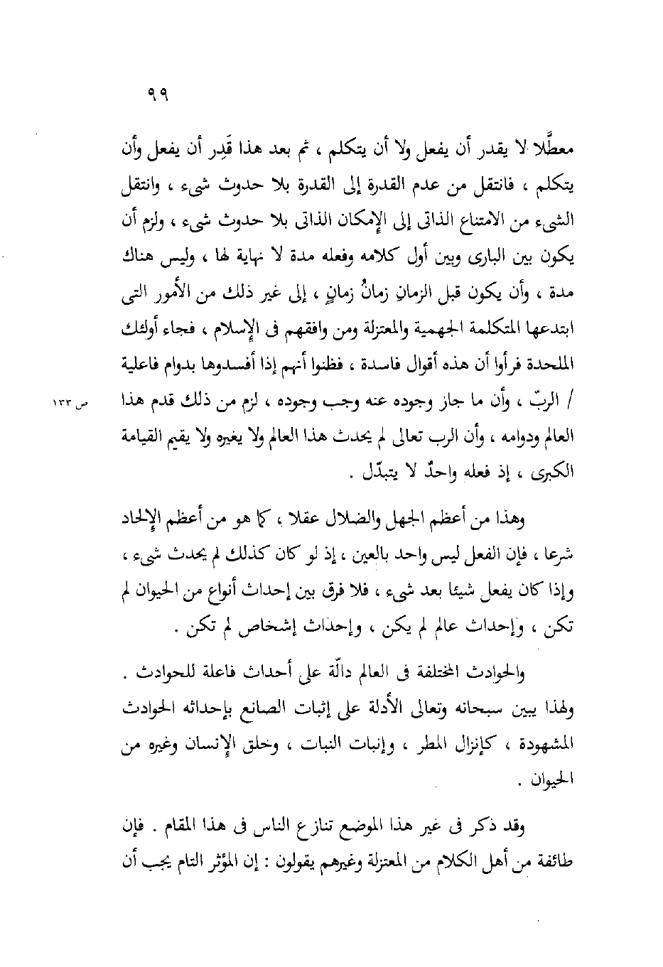 معطلا لا يقدر أن يفعل ولا أن يتكلم ثم بعد هذا قدر أن يفعل وأن يتكلم 4 فانتقل من عدم القدرة إلى القدرة بلا حدوث شيء وانتقل الشيء من الامتناع الذاتي إلى الإمكان الذاتي بلا حدوث شيء ولزم أن يكون بين الباري وبين أول كلامه وفعله مدة لا نهاية لها وليس هناك مدة وأن يكون قبل الزمان زمان زمان إلى غير ذلك من الأمور التي ابتدعها المتكلمة الجهمية والمعتزلة ومن وافقهم في الإسلام فجاء أولئك الملحدة فرأوا أن هذه أقوال فاسدة فظنوا أنهم إذا أفسدوها بدوام فاعلية الرب وأن ما جاز وجوده عنه وجب وجوده لزم من ذلك قدم هذا العالم ودوامه وأن الرب تعالى لم يحدث هذا العالم ولا يغيره ولا يقيم القيامة الكبرى إذ فعله واحد لا يتبدل.