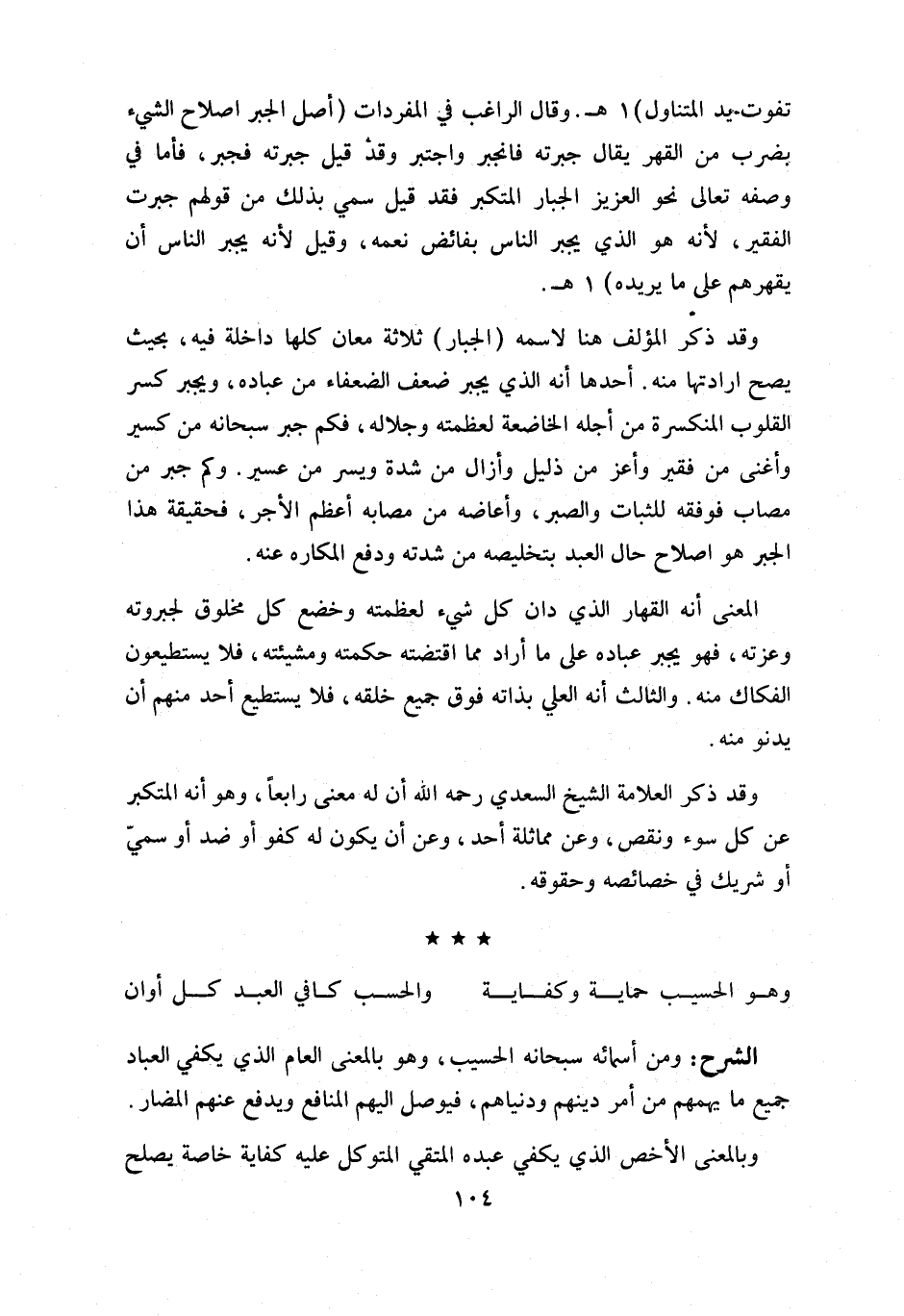 و قد ذكر العلامة الشيخ السعدي رحمه اللّه أن له معنى رابعا، وهو أنه المتكبر عن كل سوء ونقص، وعن مماثلة أحد، وعن أن يكون له كفو أو ضد أو سمي أو شريك في خصائصه وحقوقه.