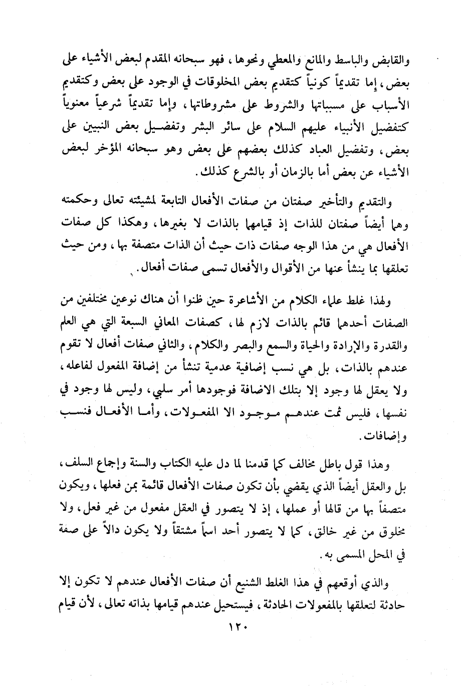و لهذا غلط علماء الكلام من الأشاعرة حين ظنوا أن هناك نوعين مختلفين من الصفات أحدهما قائم بالذات لازم لها، كصفات المعاني السبعة التي هي العلم والقدرة والإرادة والحياة والسمع والبصر والكلام، والثاني صفات أفعال لا تقوم عندهم بالذات، بل هي نسب إضافية عدمية تنشأ من إضافة المفعول لفاعله، ولا يعقل لها وجود إلا بتلك الاضافة فوجودها أمر سلبي، وليس لها وجود في نفسها، فليس ثمت عندهم موجود الا المفعولات، وأما الأفعال فنسب وإضافات.