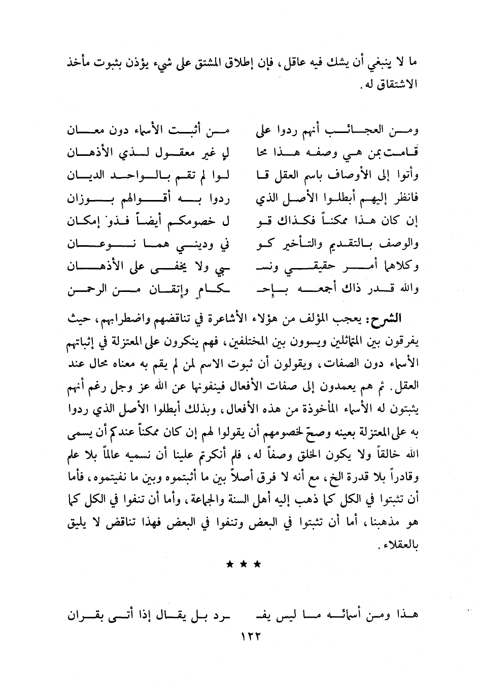 يعجب المؤلف من هؤلاء الأشاعرة في تناقضهم واضطرابهم، حيث يفرقون بين المتماثلين ويسوون بين المختلفين، فهم ينكرون على المعتزلة في إثباتهم الأسماء دون الصفات، ويقولون أن ثبوت الاسم لمن لم يقم به معناه محال عند العقل. ثم هم يعمدون إلى صفات الأفعال فينفونها عن اللّه عز وجل رغم أنهم يثبتون له الأسماء المأخوذة من هذه الأفعال، وبذلك أبطلوا الأصل الذي ردوا به على المعتزلة بعينه وصحّ لخصومهم أن يقولوا لهم إن كان ممكنا عندكم أن يسمى اللّه خالقا ولا يكون الخلق وصفا له، فلم أنكرتم علينا أن نسميه عالما بلا علم وقادرا بلا قدرة الخ، مع أنه لا فرق أصلا بين ما أثبتموه وبين ما نفيتموه، فأما أن تثبتوا في الكل كما ذهب إليه أهل السنة والجماعة، وأما أن تنفوا في الكل كما هو مذهبنا، أما أن تثبتوا في البعض وتنفوا في البعض فهذا تناقض لا يليق بالعقلاء.