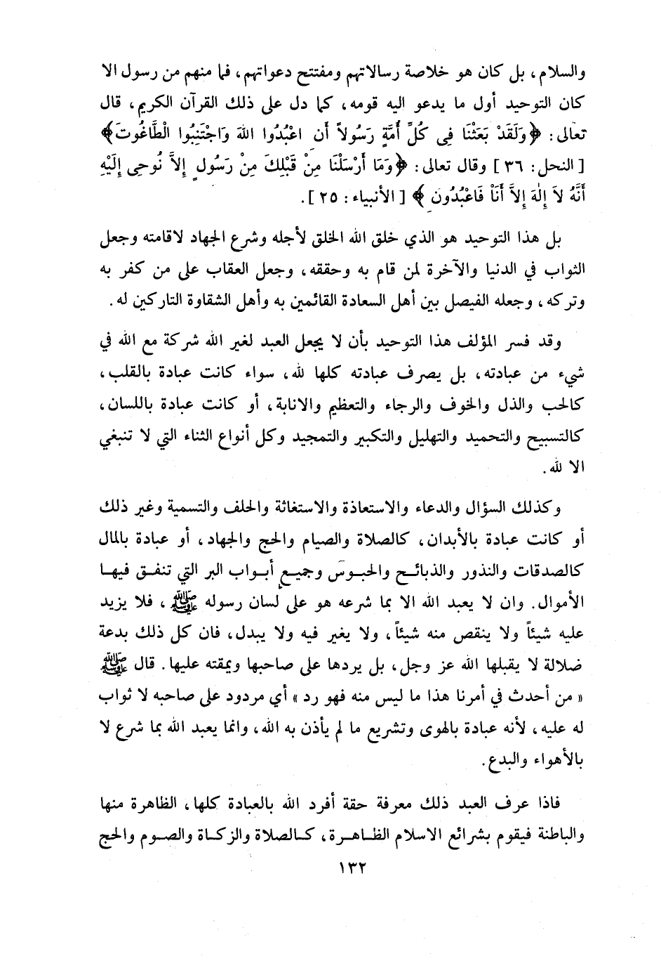 و قد فسر المؤلف هذا التوحيد بأن لا يجعل العبد لغير اللّه شركة مع اللّه في شي ء من عبادته، بل يصرف عبادته كلها للّه، سواء كانت عبادة بالقلب، كالحب والذل والخوف والرجاء والتعظيم والانابة، أو كانت عبادة باللسان، كالتسبيح والتحميد والتهليل والتكبير والتمجيد وكل أنواع الثناء التي لا تنبغي الا للّه.