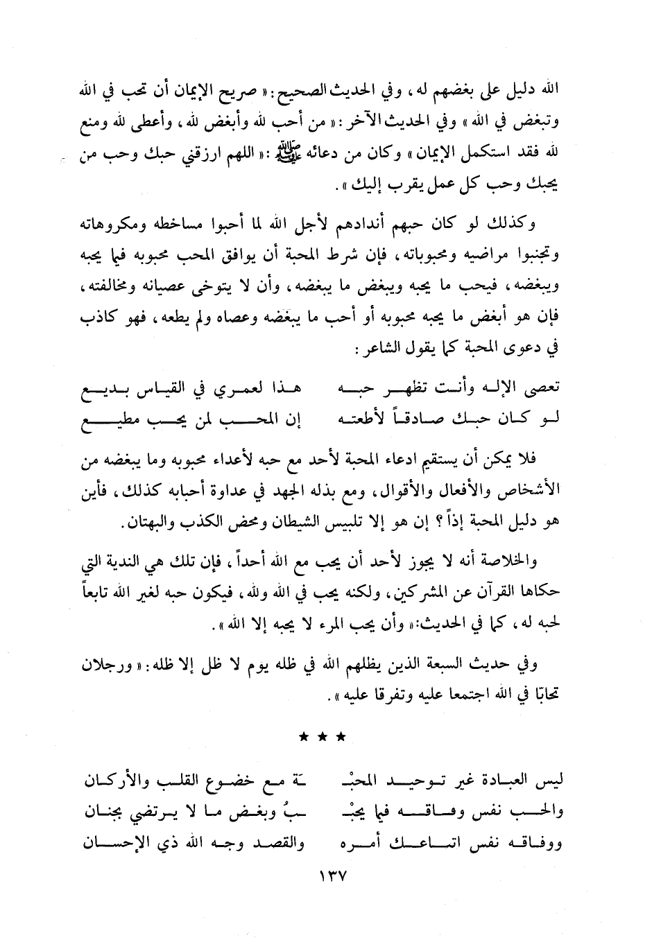 اللّه دليل على بغضهم له، وفي الحديث الصحيح: «صريح الإيمان أن تحب في اللّه وتبغض في اللّه» وفي الحديث الآخر: «من أحب للّه وأبغض للّه، وأعطى للّه ومنع للّه فقد استكمل الإيمان» وكان من دعائه صلّى اللّه عليه وسلّم: «اللهم ارزقني حبك وحب من يحبك وحب كل عمل يقرب إليك».
