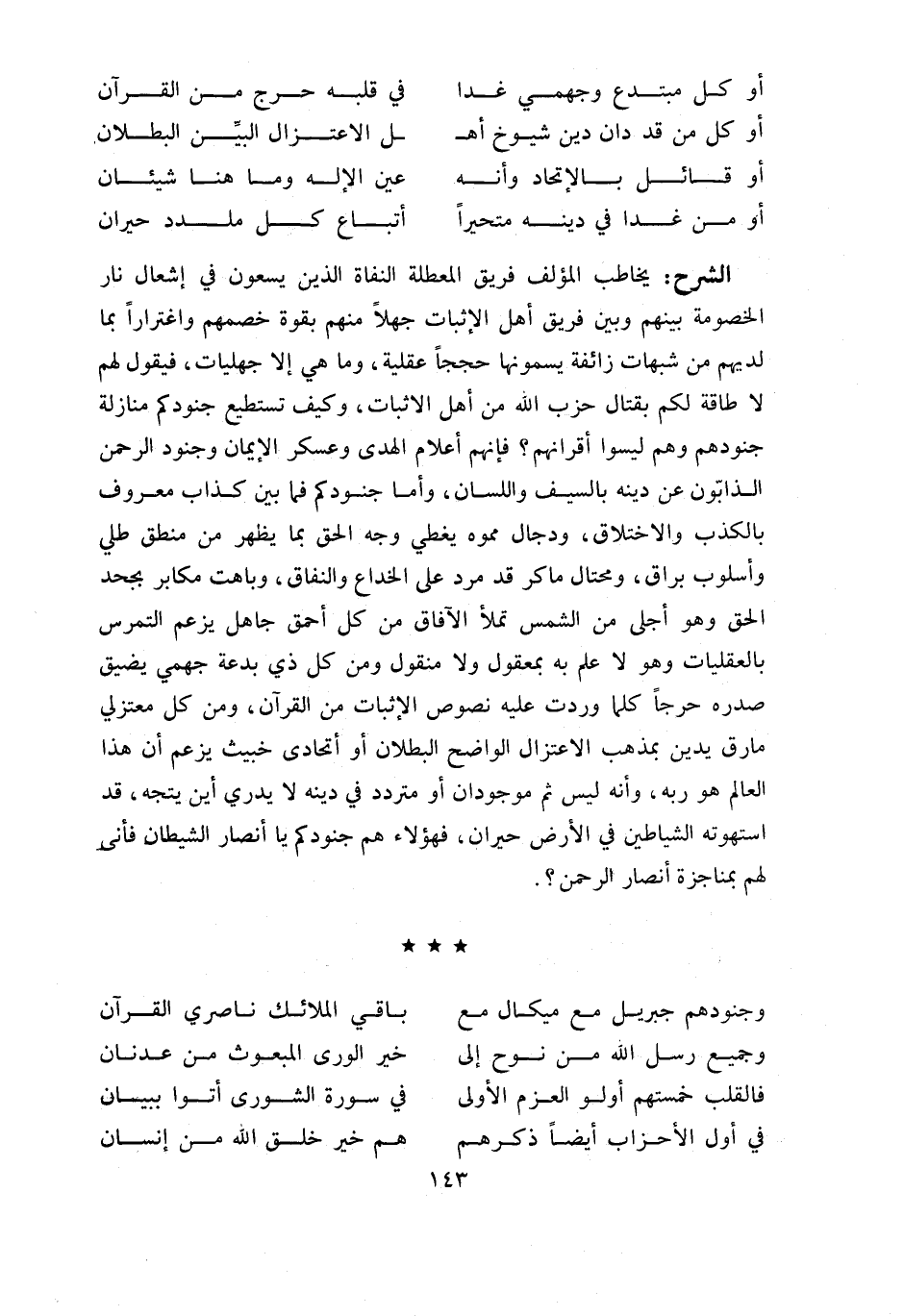 يخاطب المؤلف فريق المعطلة النفاة الذين يسعون في إشعال نار الخصومة بينهم وبين فريق أهل الإثبات جهلا منهم بقوة خصمهم واغترارا بما لديهم من شبهات زائفة يسمونها حججا عقلية، وما هي إلا جهليات، فيقول لهم لا طاقة لكم بقتال حزب اللّه من أهل الاثبات، وكيف تستطيع جنودكم منازلة جنودهم وهم ليسوا أقرانهم؟ فإنهم أعلام الهدى وعسكر الإيمان وجنود الرحمن الذابّون عن دينه بالسيف واللسان، وأما جنودكم فما بين كذاب معروف بالكذب والاختلاق، ودجال مموه يغطي وجه الحق بما يظهر من منطق طلي وأسلوب براق، ومحتال ماكر قد مرد على الخداع والنفاق، وباهت مكابر بجحد الحق وهو أجلى من الشمس تملأ الآفاق من كل أحمق جاهل يزعم التمرس بالعقليات وهو لا علم به بمعقول ولا منقول ومن كل ذي بدعة جهمي يضيق صدره حرجا كلما وردت عليه نصوص الإثبات من القرآن، ومن كل معتزلي مارق يدين بمذهب الاعتزال الواضح البطلان أو اتحادي خبيث يزعم أن هذا العالم هو ربه، وأنه ليس ثم موجودان أو متردد في دينه لا يدري أين يتجه، قد استهوته الشياطين في الأرض حيران، فهؤلاء هم جنودكم يا أنصار الشيطان فأنى لهم بمناجزة أنصار الرحمن؟.