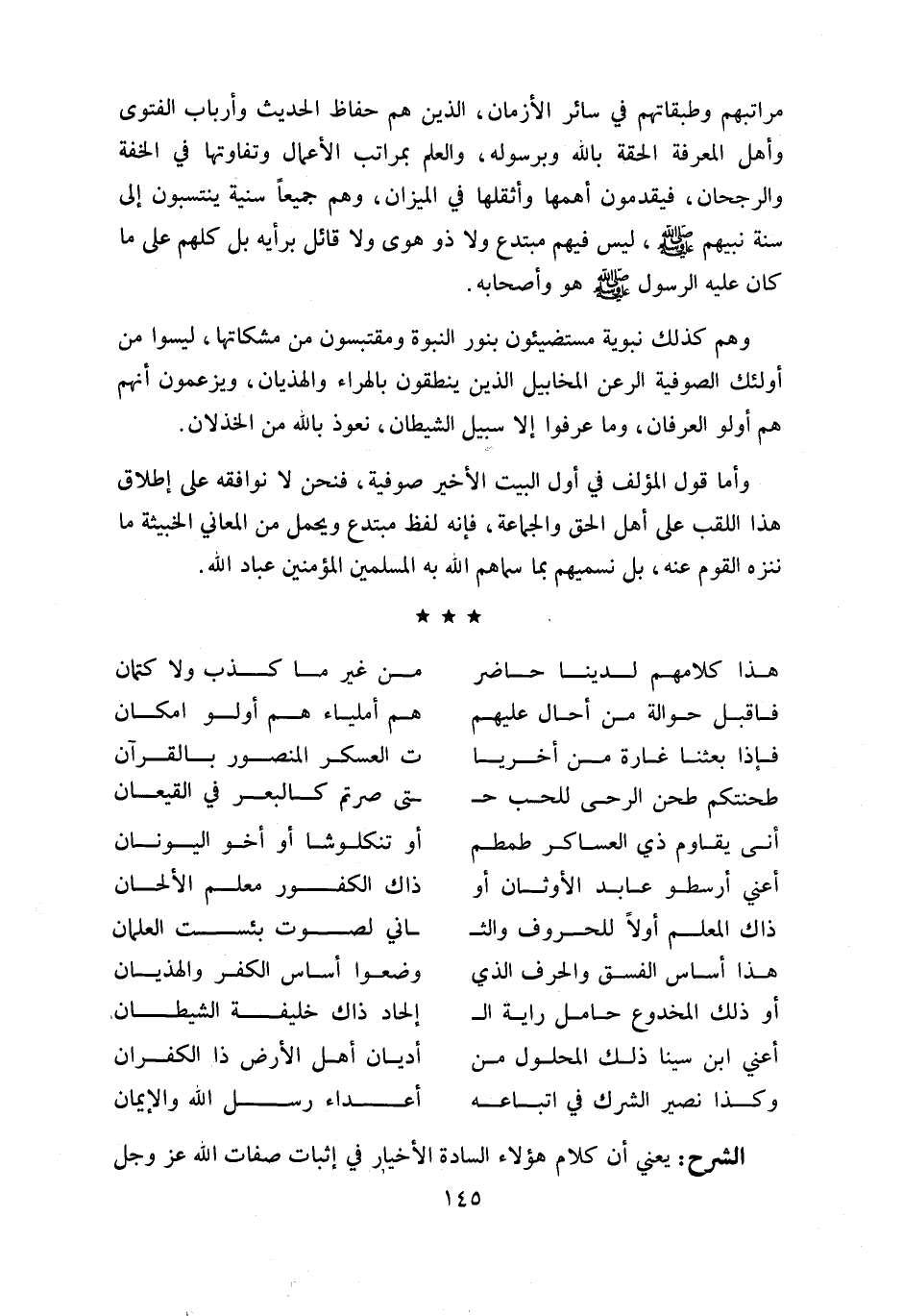 و أما قول المؤلف في أول البيت الأخير صوفية، فنحن لا نوافقه على إطلاق هذا اللقب على أهل الحق والجماعة، فإنه لفظ مبتدع ويحمل من المعاني الخبيثة ما ننزه القوم عنه، بل نسميهم بما سماهم اللّه به المسلمين المؤمنين عباد اللّه.