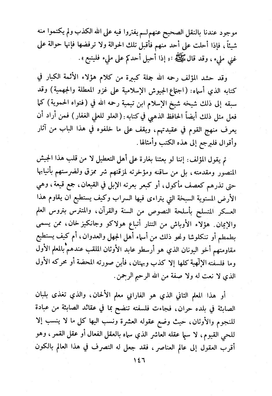 ثم يقول المؤلف: إننا لو بعثنا بغارة على أهل التعطيل لا من قلب هذا الجيش المنصور ومقدمته، بل من ساقته ومؤخرته لمزقتهم شر ممزق ولضرستهم بأنيابها حتى تذرهم كعصف مأكول، أو كبعر بعرته الإبل في القيعان، جمع قيعة، وهي الأرض المستوية السبخة التي يتراءى فيها السراب وكيف يستطيع أن يقاوم هذا العسكر المتسلح بأسلحة النصوص من السنة والقرآن، والمتترس بتروس العلم والإيمان. هؤلاء الأوباش من التتار أتباع هولاكو وجانكيز خان، ممن يسمى بطمطم أو تنكلوشا ونحو ذلك من أسماء أهل الجهل والعدوان، أم كيف يستطيع مقاومتهم أخو اليونان الذي هو أرسطو عابد الأوثان الملقب عندهم بالمعلم الأول وما فلسفته الإلهية كلها إلا كذب وبهتان، فأين صورته المحضة أو محركه الأول الذي لا نعت له ولا صفة من اللّه الرحيم الرحمن.