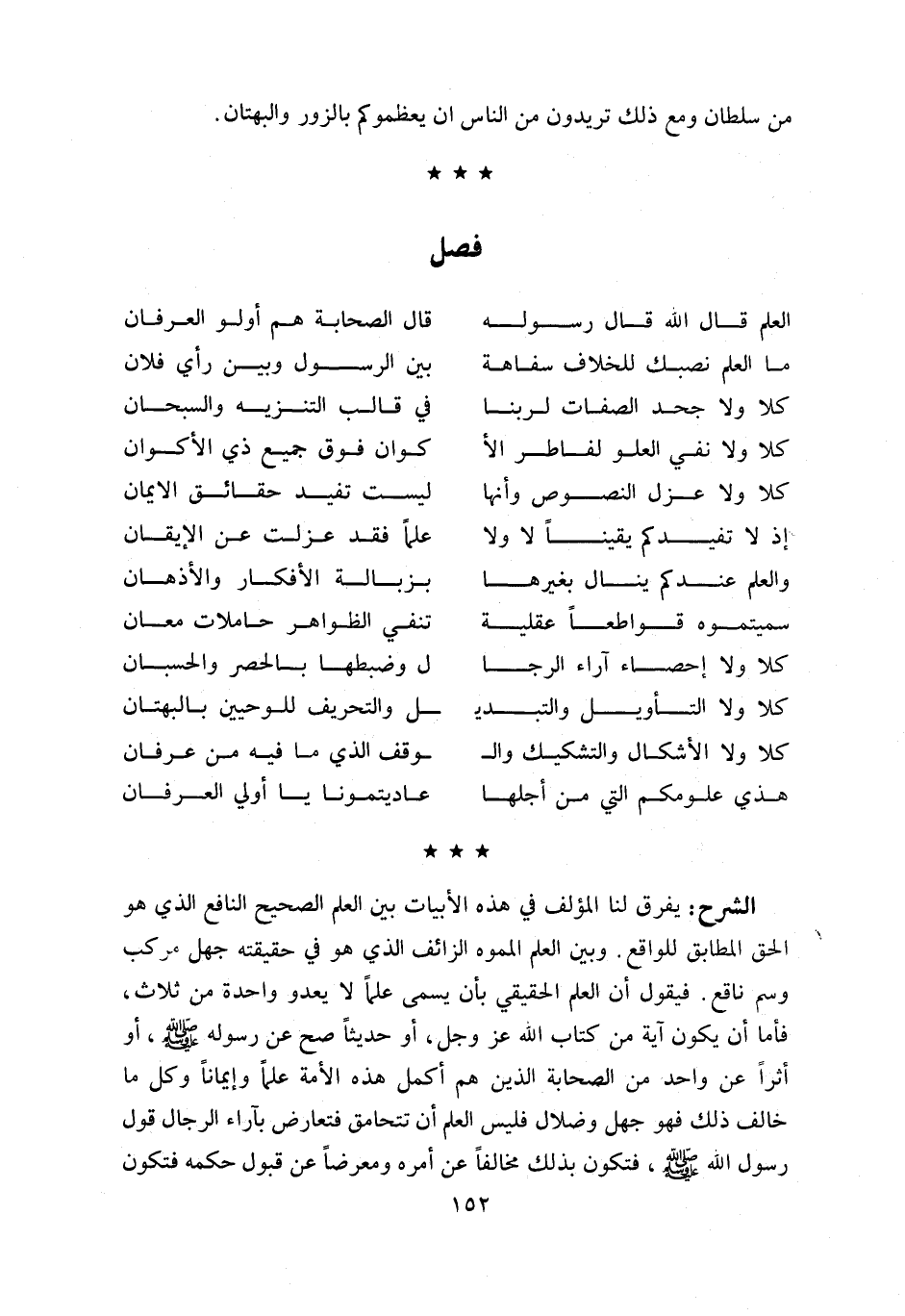 يفرق لنا المؤلف في هذه الأبيات بين العلم الصحيح النافع الذي هو الحق المطابق للواقع. وبين العلم المموه الزائف الذي هو في حقيقته جهل مركب وسم ناقع. فيقول أن العلم الحقيقي بأن يسمى علما لا يعدو واحدة من ثلاث، فأما أن يكون آية من كتاب اللّه عز وجل، أو حديثا صح عن رسوله صلّى اللّه عليه وسلّم، أو أثرا عن واحد من الصحابة الذين هم أكمل هذه الأمة علما وإيمانا وكل ما خالف ذلك فهو جهل وضلال فليس العلم أن تتحامق فتعارض بآراء الرجال قول رسول اللّه صلّى اللّه عليه وسلّم، فتكون بذلك مخالفا عن أمره ومعرضا عن قبول حكمه فتكون