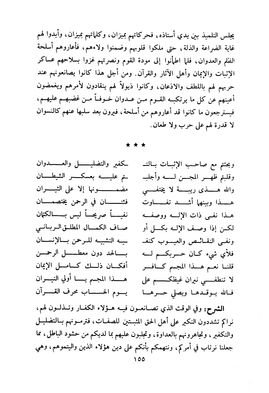 وفي الوقت الذي تصانعون فيه هؤلاء الكفار وتذلون لهم، نراكم تشددون النكير على أهل الحق المثبتين للصفات، فترمونهم بالتضليل والتكفير، وتجاهرونهم بالعداوة، وتجلبون عليهم بما لديكم من حشود الباطل، مما جعلنا نرتاب في أمركم، ونتهمكم بأنكم على دين هؤلاء الذين واليتموهم، وهي