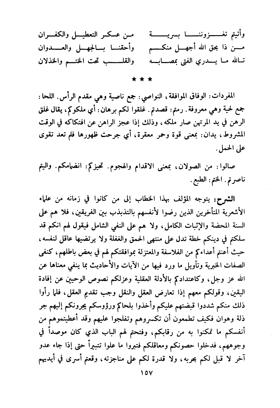 يتوجه المؤلف بهذا الخطاب إلى من كانوا في زمانه من علماء الأشعرية المتأخرين الذين رضوا لأنفسهم بالتذبذب بين الفريقين، فلا هم على السنة المحضة والإثبات الكامل، ولا هم على النفي الشامل فيقول لهم انكم قد سلكتم في دينكم خطة تدل على منتهى الحمق والغفلة ولا يرتضيها عاقل لنفسه، حيث أعنتم أعداءكم من الفلاسفة والمعتزلة بموافقتكم لهم في بعض باطلهم، كنفى الصفات الخبرية وتأويل ما ورد فيها من الآيات والأحاديث بما ينفي معناها عن اللّه عز وجل، وكاعتدادكم بالأدلة العقلية وعزلكم نصوص الوحيين عن إفادة اليقين، وقولكم معهم إذا تعارض العقل والنقل وجب تقديم العقل، فلما رأوا ذلك منكم شددوا قبضتهم عليكم وأخذوا بلحاكم ورءوسكم يجرونكم إليهم جر ذلة وهوان فكيف تطعمون أن تكسروهم وتفلجوا عليهم وقد أعطيتموهم من أنفسكم ما تمكنوا به من رقابكم، وفتحتم لهم الباب الذي كان موصدا في وجوههم، فدخلوا حصونكم ومعاقلكم فتبروا ما علوا تتبيرا حتى إذا جاء عدو آخر لا قبل لكم بحربه، ولا قدرة لكم على مناجزته، وقعتم أسرى في أيديهم