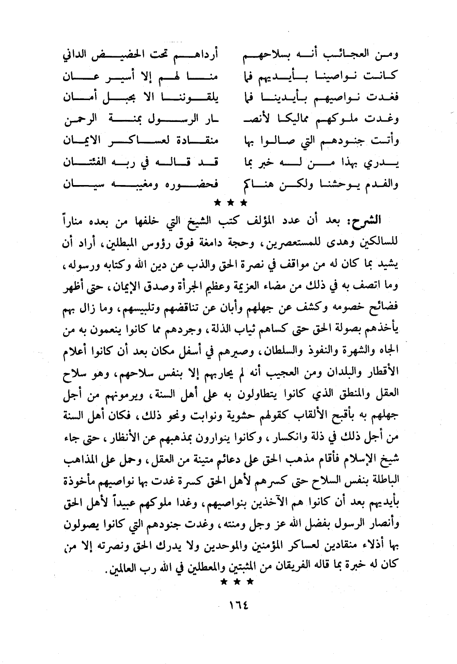 بعد أن عدد المؤلف كتب الشيخ التي خلفها من بعده منارا للسالكين وهدى للمستعصرين، وحجة دامغة فوق رءوس المبطلين، أراد أن يشيد بما كان له من مواقف في نصرة الحق والذب عن دين اللّه وكتابه ورسوله، وما اتصف به في ذلك من مضاء العزيمة وعظيم الجرأة وصدق الإيمان، حتى أظهر فضائح خصومه وكشف عن جهلهم وأبان عن تناقضهم وتلبيسهم، وما زال بهم يأخذهم بصولة الحق حتى كساهم ثياب الذلة، وجردهم مما كانوا ينعمون به من الجاه والشهرة والنفوذ والسلطان، وصيرهم في أسفل مكان بعد أن كانوا أعلام الأقطار والبلدان ومن العجيب أنه لم يحاربهم إلا بنفس سلاحهم، وهو سلاح العقل والمنطق الذي كانوا يتطاولون به على أهل السنة، ويرمونهم من أجل جهلهم به بأقبح الألقاب كقولهم حشوية ونوابت ونحو ذلك، فكان أهل السنة من أجل ذلك في ذلة وانكسار، وكانوا يتوارون بمذهبهم عن الأنظار، حتى جاء شيخ الإسلام فأقام مذهب الحق على دعائم متينة من العقل، وحمل على المذاهب الباطلة بنفس السلاح حتى كسرهم لأهل الحق كسرة غدت بها نواصيهم مأخوذة بأيديهم بعد أن كانوا هم الآخذين بنواصيهم، وغدا ملوكهم عبيدا لأهل الحق وأنصار الرسول بفضل اللّه عز وجل ومنته، وغدت جنودهم التي كانوا يصولون بها أذلاء منقادين لعساكر المؤمنين والموحدين ولا يدرك الحق ونصرته إلا من كان له خبرة بما قاله الفريقان من المثبتين والمعطلين في اللّه رب العالمين.
