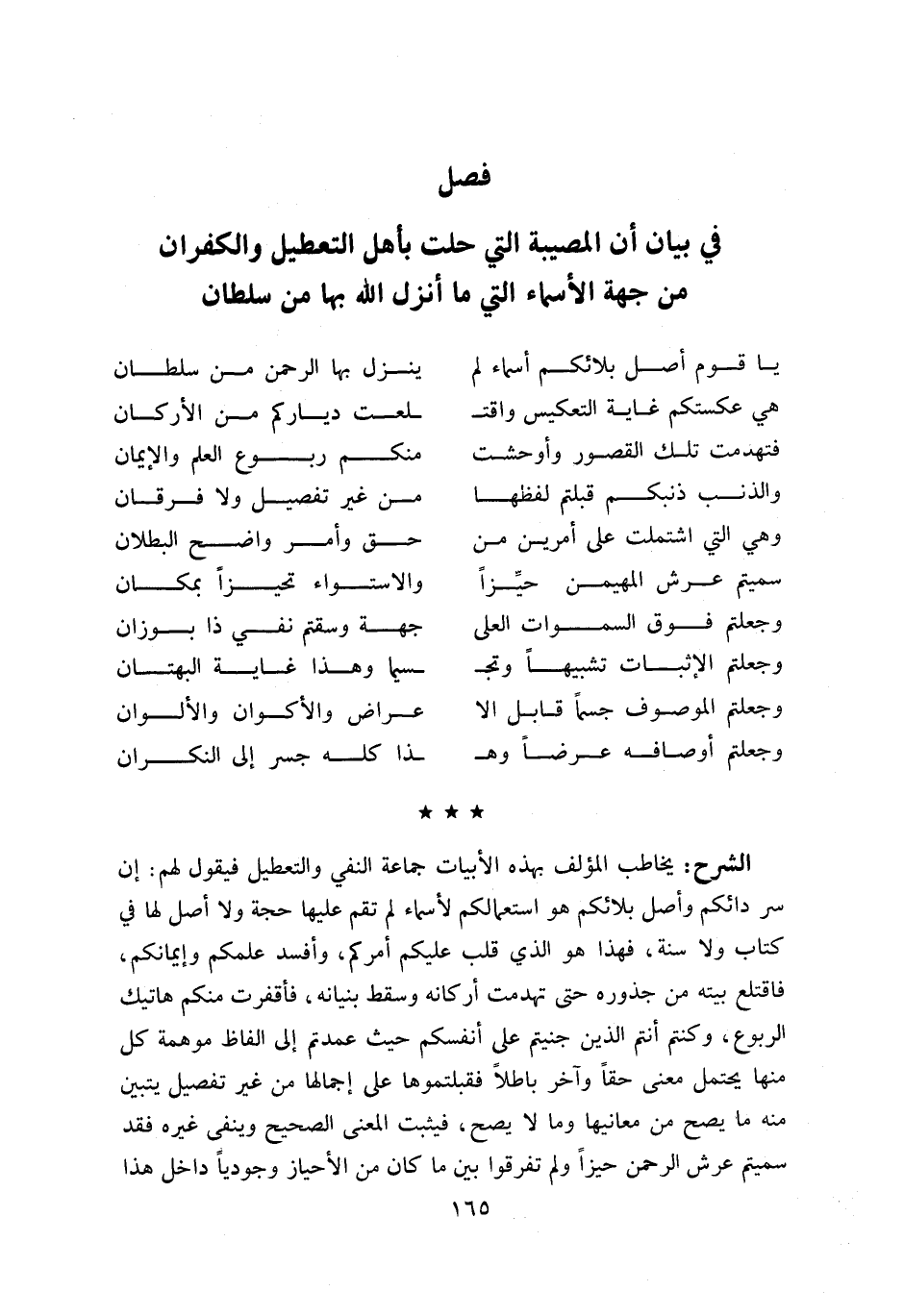 يخاطب المؤلف بهذه الأبيات جماعة النفي والتعطيل فيقول لهم: إن سر دائكم وأصل بلائكم هو استعمالكم لأسماء لم تقم عليها حجة ولا أصل لها في كتاب ولا سنة، فهذا هو الذي قلب عليكم أمركم، وأفسد علمكم وإيمانكم، فاقتلع بيته من جذوره حتى تهدمت أركانه وسقط بنيانه، فأقفرت منكم هاتيك الربوع، وكنتم أنتم الذين جنيتم على أنفسكم حيث عمدتم إلى الفاظ موهمة كل منها يحتمل معنى حقا وآخر باطلا فقبلتموها على إجمالها من غير تفصيل يتبين منه ما يصح من معانيها وما لا يصح، فيثبت المعنى الصحيح وينفى غيره فقد سميتم عرش الرحمن حيزا ولم تفرقوا بين ما كان من الأحياز وجوديا داخل هذا