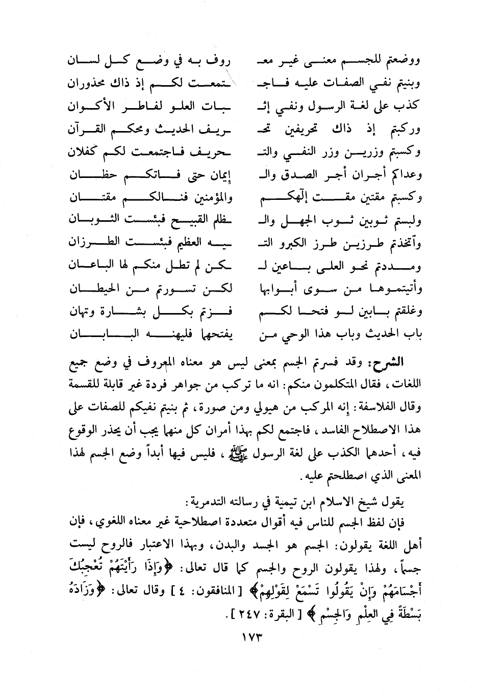 وقد فسرتم الجسم بمعنى ليس هو معناه المعروف في وضع جميع اللغات، فقال المتكلمون منكم: انه ما تركب من جواهر فردة غير قابلة للقسمة وقال الفلاسفة: إنه المركب من هيولى ومن صورة، ثم بنيتم نفيكم للصفات على هذا الاصطلاح الفاسد، فاجتمع لكم بهذا أمران كل منهما يجب أن يحذر الوقوع فيه، أحدهما الكذب على لغة الرسول صلّى اللّه عليه وسلّم، فليس فيها أبدا وضع الجسم لهذا المعنى الذي اصطلحتم عليه.