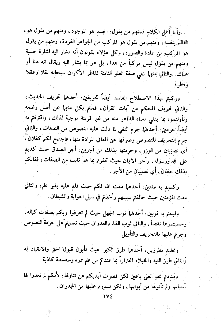 و أما أهل الكلام فمنهم من يقول: الجسم هو الموجود، ومنهم من يقول هو القائم بنفسه، ومنهم من يقول هو المركب من الجواهر الفردة، ومنهم من يقول هو المركب من المادة والصورة، وكل هؤلاء يقولون أنه مشار إليه اشارة حسية ومنهم من يقول ليس مركبا من هذا، بل هو بما يشار إليه ويقال انه هنا أو هناك. والثاني منهما نفي صفة العلو الثابتة لفاطر الأكوان سبحانه نقلا وعقلا وفطرة.