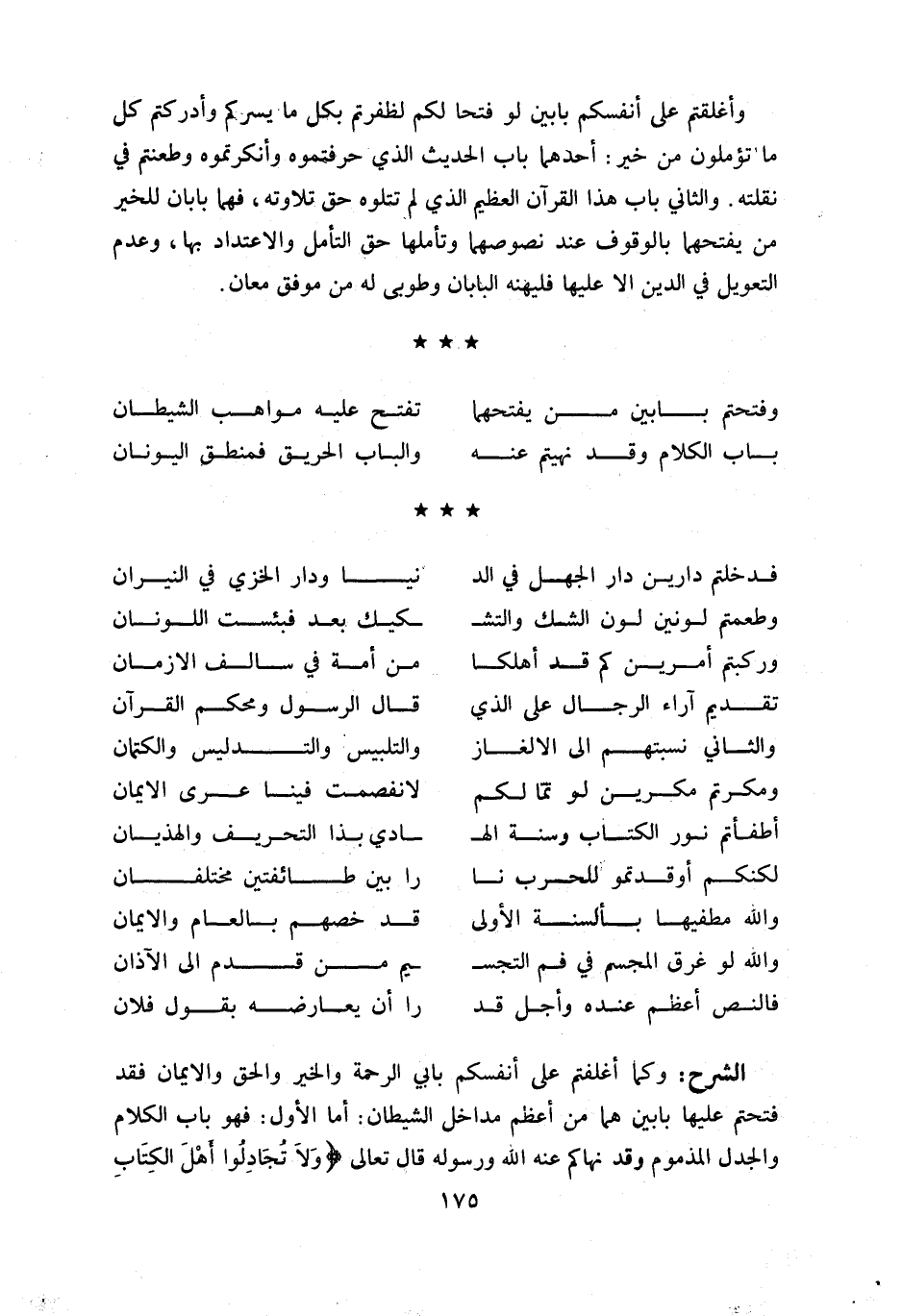 و أغلقتم على أنفسكم بابين لو فتحا لكم لظفرتم بكل ما يسركم وأدركتم كل ما تؤملون من خير: أحدهما باب الحديث الذي حرفتموه وأنكرتموه وطعنتم في نقلته. والثاني باب هذا القرآن العظيم الذي لم تتلوه حق تلاوته، فهما بابان للخير من يفتحهما بالوقوف عند نصوصهما وتأملها حق التأمل والاعتداد بها، وعدم التعويل في الدين الا عليها فليهنه البابان وطوبى له من موفق معان.