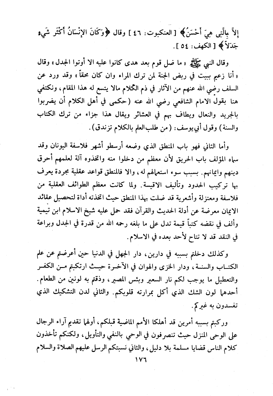 و قال النبي صلّى اللّه عليه وسلّم «ما ضل قوم بعد هدى كانوا عليه الا أوتوا الجدل» وقال «أنا زعيم ببيت في ربض الجنة لمن ترك المراء وان كان محقا» وقد ورد عن السلف رضي اللّه عنهم من الآثار في ذم الكلام ما لا يتسع له هذا المقام، ونكتفي هنا بقول الامام الشافعي رضي اللّه عنه (حكمى في أهل الكلام أن يضربوا بالجريد والنعال ويطاف بهم في العشائر ويقال هذا جزاء من ترك الكتاب والسنة) وقول أبي يوسف: (من طلب العلم بالكلام تزندق).