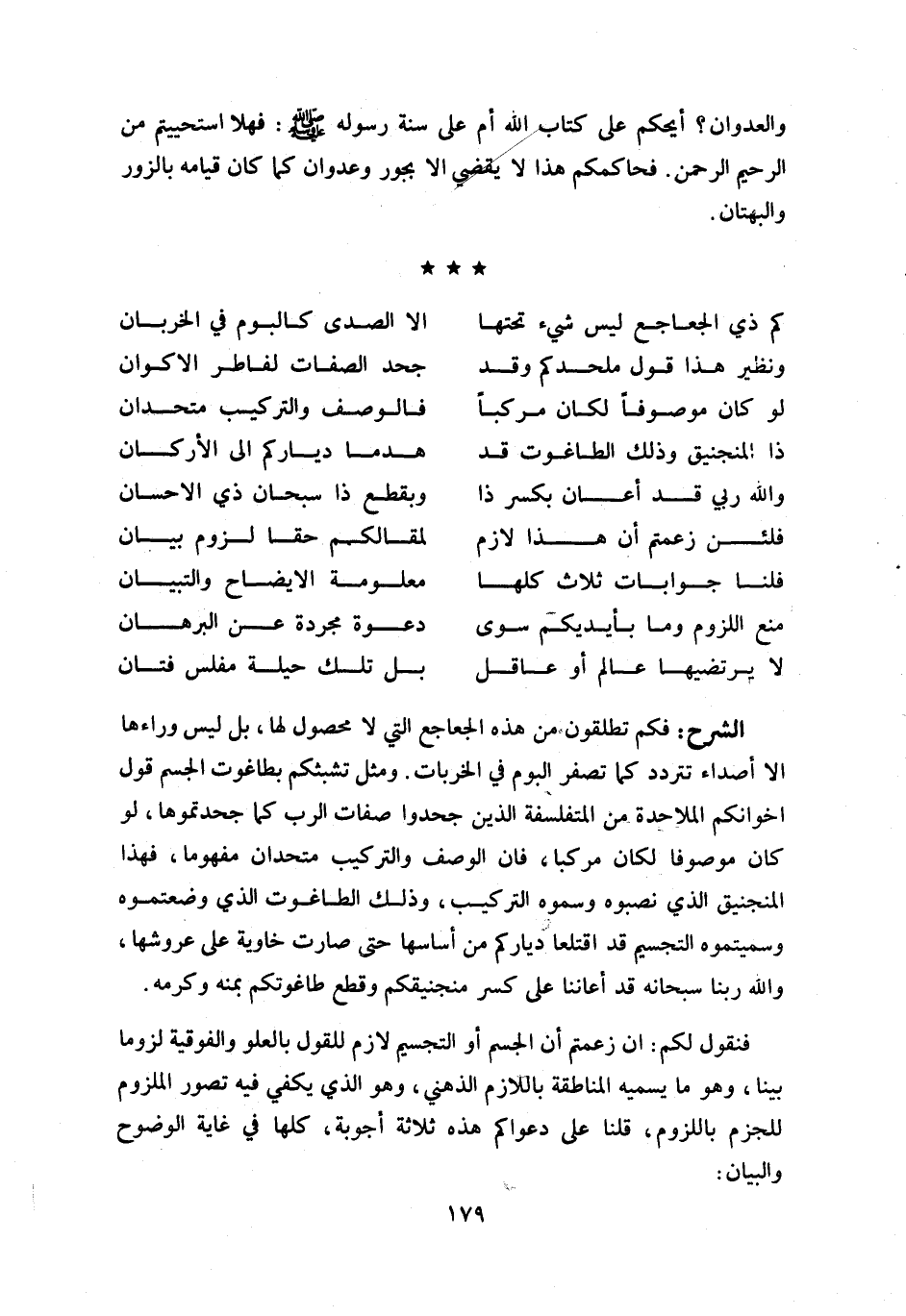 فكم تطلقون من هذه الجعاجع التي لا محصول لها، بل ليس وراءها الا أصداء تتردد كما تصفر البوم في الخربات. ومثل تشبثكم بطاغوت الجسم قول اخوانكم الملاحدة من المتفلسفة الذين جحدوا صفات الرب كما جحدتموها، لو كان موصوفا لكان مركبا، فان الوصف والتركيب متحدان مفهوما، فهذا المنجنيق الذي نصبوه وسموه التركيب، وذلك الطاغوت الذي وضعتموه وسميتموه التجسيم قد اقتلعا دياركم من أساسها حتى صارت خاوية على عروشها، واللّه ربنا سبحانه قد أعاننا على كسر منجنيقكم وقطع طاغوتكم بمنه وكرمه.