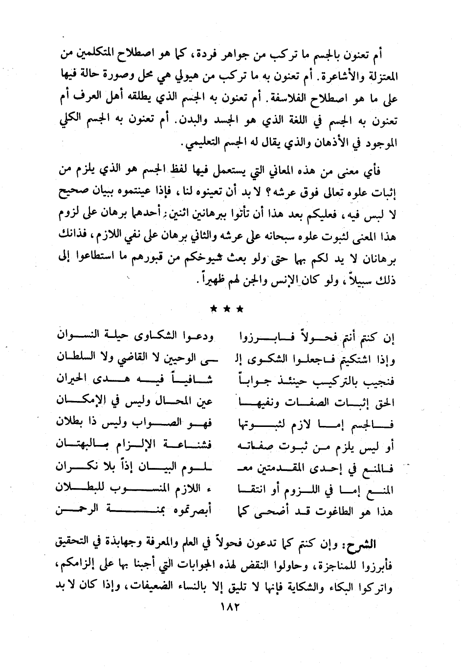 فأي معنى من هذه المعاني التي يستعمل فيها لفظ الجسم هو الذي يلزم من إثبات علوه تعالى فوق عرشه؟ لا بد أن تعينوه لنا، فإذا عينتموه ببيان صحيح لا لبس فيه، فعليكم بعد هذا أن تأتوا ببرهانين اثنين: أحدهما برهان على لزوم هذا المعنى لثبوت علوه سبحانه على عرشه والثاني برهان على نفي اللازم، فذانك برهانان لا يد لكم بهما حتى ولو بعث شيوخكم من قبورهم ما استطاعوا إلى ذلك سبيلا، ولو كان الإنس والجن لهم ظهيرا.