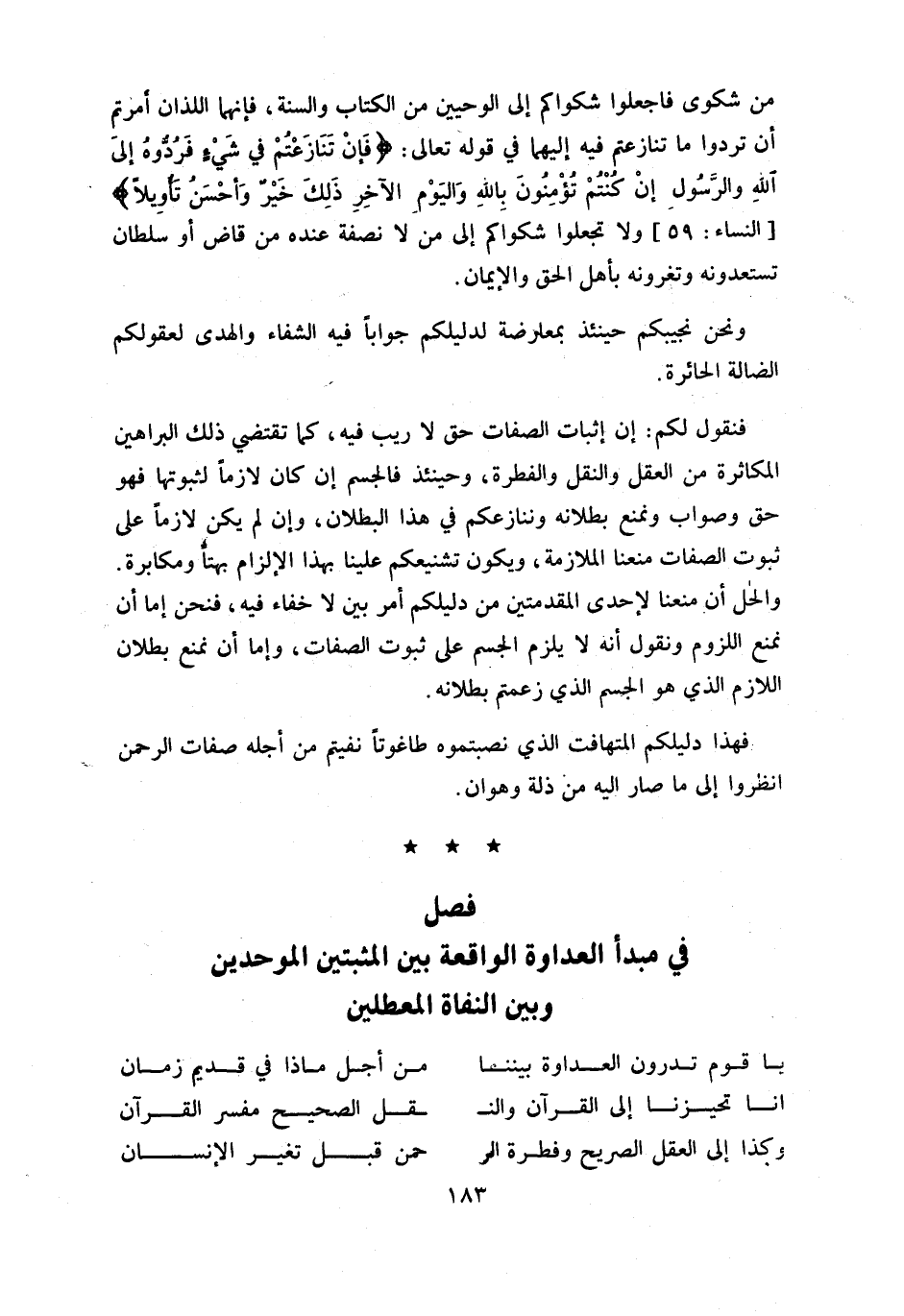 فصل في مبدأ العداوة الواقعة بين المثبتين الموحدين وبين النفاة المعطلين
