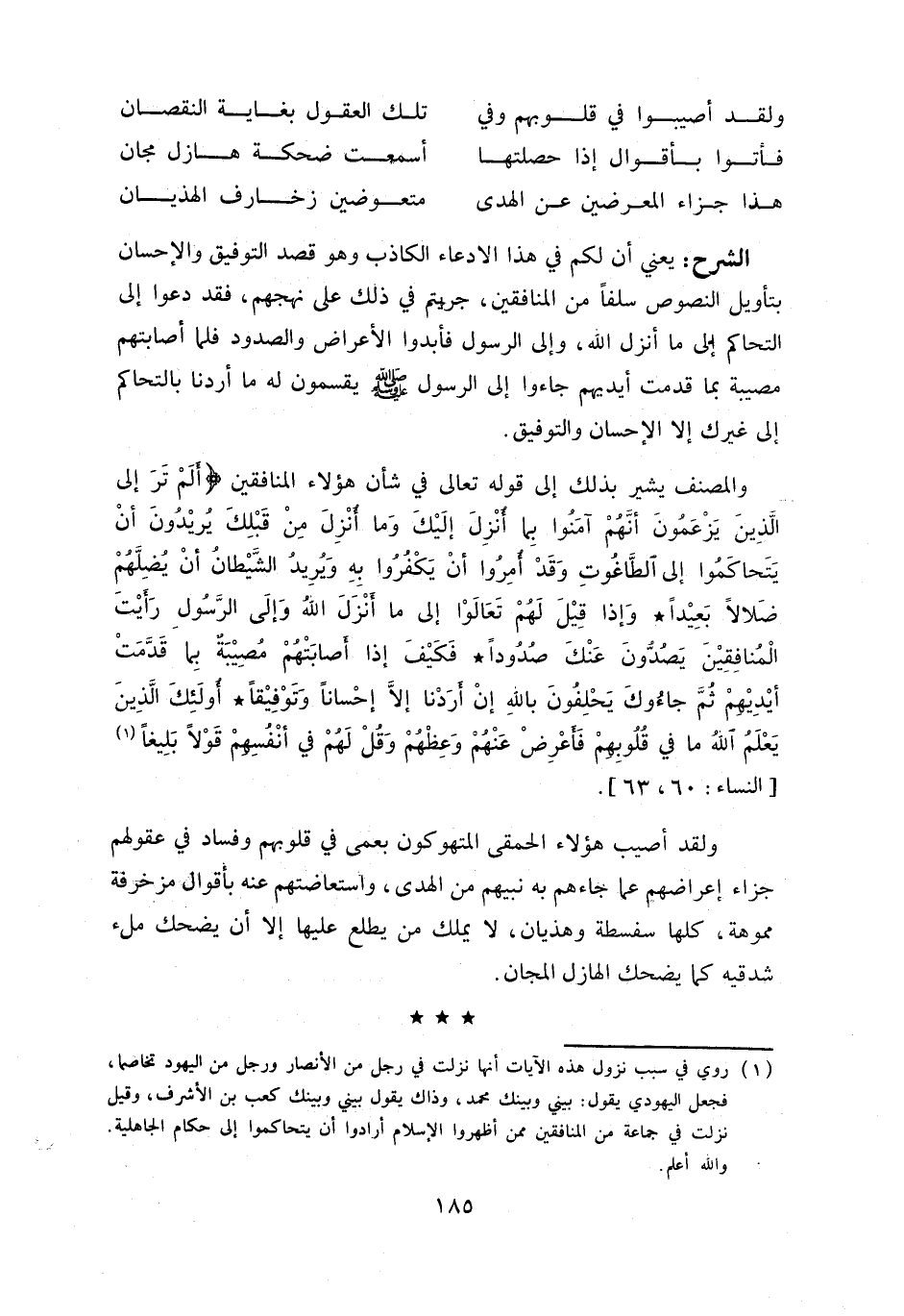 و المصنف يشير بذلك إلى قوله تعالى في شأن هؤلاء المنافقين أَ لَمْ تَرَ إِلَى الَّذِينَ يَزْعُمُونَ أَنَّهُمْ آمَنُوا بِما أُنْزِلَ إِلَيْكَ وما أُنْزِلَ مِنْ قَبْلِكَ يُرِيدُونَ أَنْ يَتَحاكَمُوا إِلَى الطَّاغُوتِ وقَدْ أُمِرُوا أَنْ يَكْفُرُوا بِهِ ويُرِيدُ الشَّيْطانُ أَنْ يُضِلَّهُمْ ضَلالًا بَعِيداً وإِذا قِيلَ لَهُمْ تَعالَوْا إِلى ما أَنْزَلَ اللَّهُ وإِلَى الرَّسُولِ رَأَيْتَ الْمُنافِقِينَ يَصُدُّونَ عَنْكَ صُدُوداً* فَكَيْفَ إِذا أَصابَتْهُمْ مُصِيبَةٌ بِما قَدَّمَتْ أَيْدِيهِمْ ثُمَّ جاؤُكَ يَحْلِفُونَ بِاللَّهِ إِنْ أَرَدْنا إِلَّا إِحْساناً وتَوْفِيقاً* أُولئِكَ الَّذِينَ يَعْلَمُ اللَّهُ ما فِي قُلُوبِهِمْ فَأَعْرِضْ عَنْهُمْ وعِظْهُمْ وقُلْ لَهُمْ فِي أَنْفُسِهِمْ قَوْلًا بَلِيغاً «1» [النساء: 60، 63].