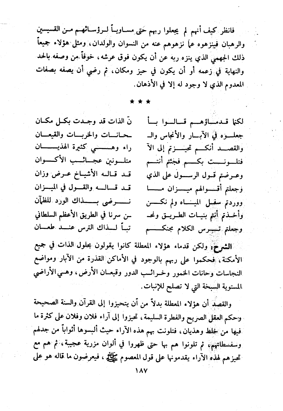 ولكن قدماء هؤلاء المعطلة كانوا يقولون بحلول الذات في جميع الأمكنة، فحكموا على ربهم بالوجود في الأماكن القذرة من الآبار ومواضع النجاسات وحانات الخمور وخرائب الدور وقيعان الأرض، وهي الأراضي المستوية السبخة التي لا تصلح للإنبات.