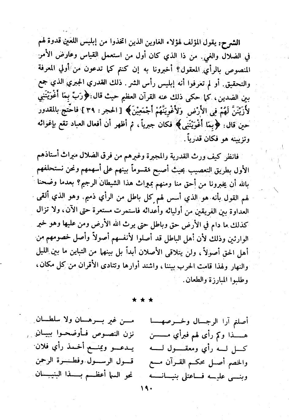 يقول المؤلف لهؤلاء الغاوين الذين اتخذوا من إبليس اللعين قدوة لهم في الضلال والغي. من ذا الذي كان أول من استعمل القياس وعارض الأمر المنصوص بالرأي المعقول؟ أخبرونا به إن كنتم كما تدعون من أولي المعرفة والتحقيق. أو لم تعرفوا أنه إبليس رأس الشر. ذلك القدري الجبري الذي جمع بين الضدين، كما حكى ذلك عنه القرآن العظيم حيث قال: رَبِّ بِما أَغْوَيْتَنِي لَأُزَيِّنَنَّ لَهُمْ فِي الْأَرْضِ ولَأُغْوِيَنَّهُمْ أَجْمَعِينَ [الحجر: 39] فاحتج بالمقدور حين قال: بِما أَغْوَيْتَنِي فكان جبريا، ثم أظهر أن أفعال العباد تقع بإغوائه وتزيينه هو فكان قدريا.