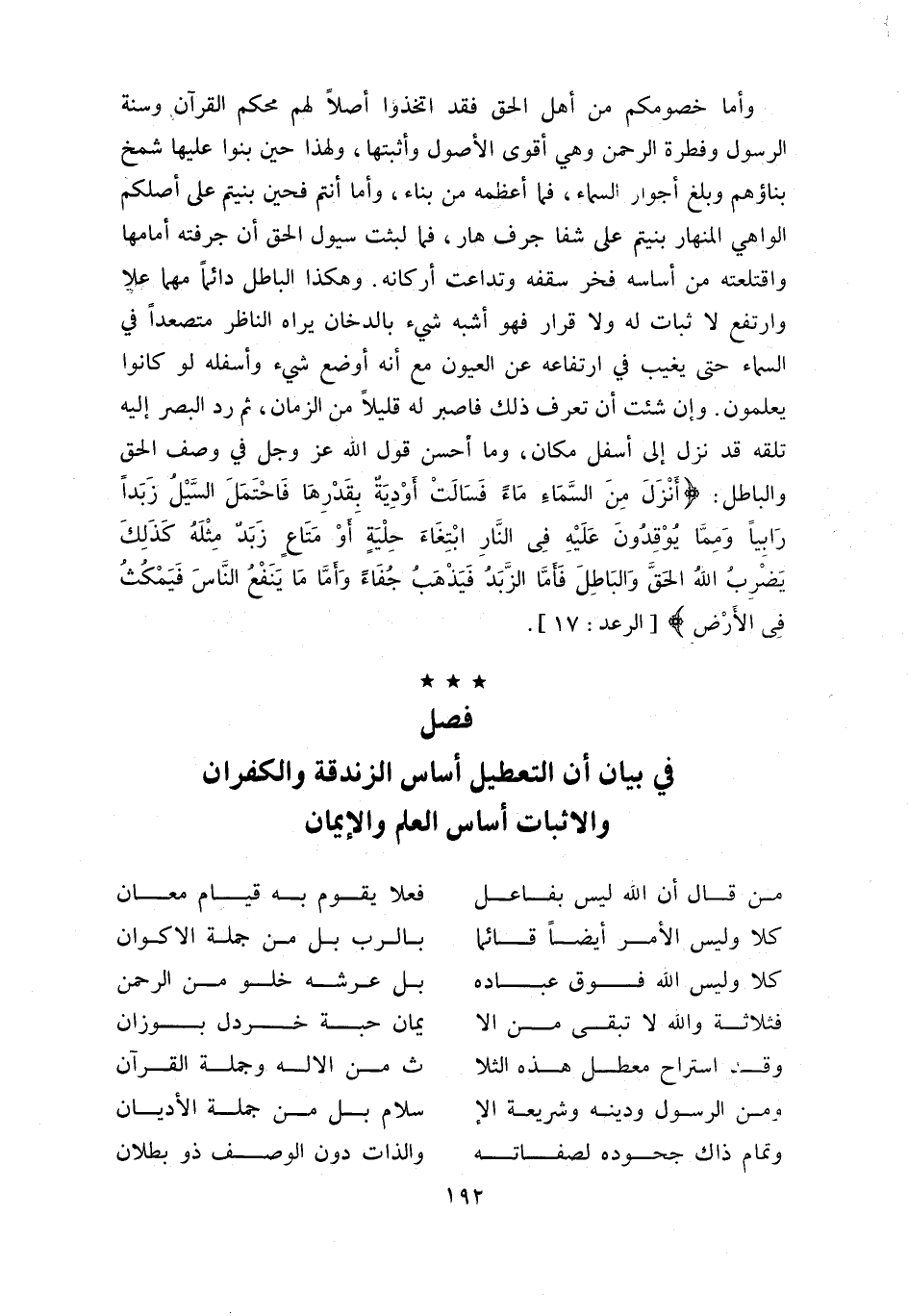 و أما خصومكم من أهل الحق فقد اتخذوا أصلا لهم محكم القرآن وسنة الرسول وفطرة الرحمن وهي أقوى الأصول وأثبتها، ولهذا حين بنوا عليها شمخ بناؤهم وبلغ أجواز السماء، فما أعظمه من بناء، وأما أنتم فحين بنيتم على أصلكم الواهي المنهار بنيتم على شفا جرف هار، فما لبثت سيول الحق أن جرفته أمامها واقتلعته من أساسه فخر سقفه وتداعت أركانه. وهكذا الباطل دائما مهما علا وارتفع لا ثبات له ولا قرار فهو أشبه شي ء بالدخان يراه الناظر متصعدا في السماء حتى يغيب في ارتفاعه عن العيون مع أنه أوضع شي ء وأسفله لو كانوا يعلمون. وإن شئت أن تعرف ذلك فاصبر له قليلا من الزمان، ثم رد البصر إليه تلقه قد نزل إلى أسفل مكان، وما أحسن قول اللّه عز وجل في وصف الحق والباطل: أَنْزَلَ مِنَ السَّماءِ ماءً فَسالَتْ أَوْدِيَةٌ بِقَدَرِها فَاحْتَمَلَ السَّيْلُ زَبَداً رابِياً ومِمَّا يُوقِدُونَ عَلَيْهِ فِي النَّارِ ابْتِغاءَ حِلْيَةٍ أَوْ مَتاعٍ زَبَدٌ مِثْلُهُ كَذلِكَ يَضْرِبُ اللَّهُ الْحَقَّ والْباطِلَ فَأَمَّا الزَّبَدُ فَيَذْهَبُ جُفاءً وأَمَّا ما يَنْفَعُ النَّاسَ فَيَمْكُثُ فِي الْأَرْضِ [الرعد: 17].
