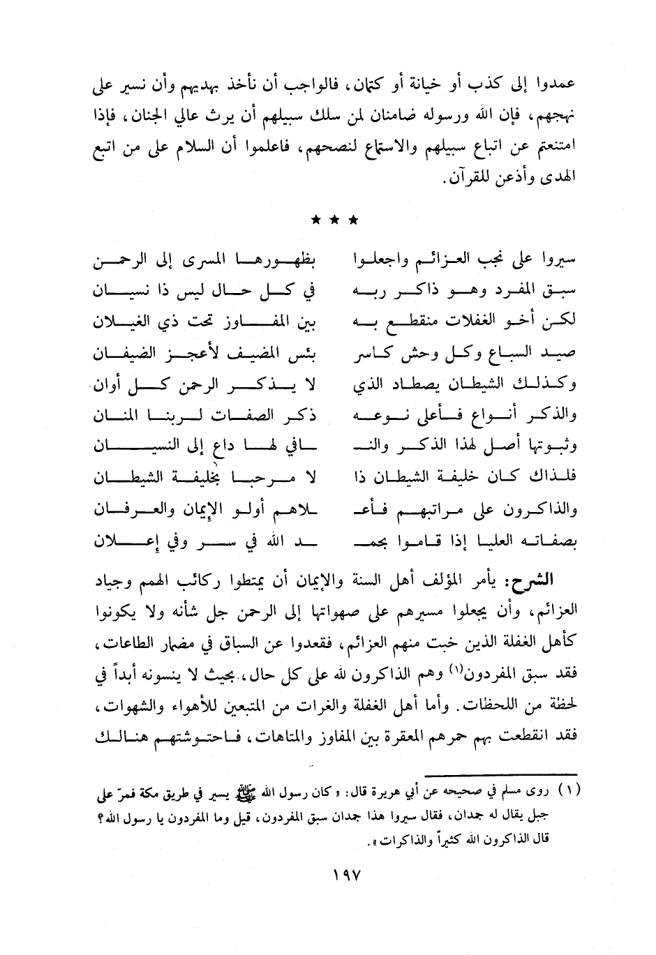 يأمر المؤلف أهل السنة والإيمان أن يمتطوا ركائب الهمم وجياد العزائم، وأن يجعلوا مسيرهم على صهواتها إلى الرحمن جل شأنه ولا يكونوا كأهل الغفلة الذين خبت منهم العزائم، فقعدوا عن السباق في مضمار الطاعات، فقد سبق المفردون «1» وهم الذاكرون للّه على كل حال، بحيث لا ينسونه أبدا في لحظة من اللحظات. وأما أهل الغفلة والغرات من المتبعين للأهواء والشهوات، فقد انقطعت بهم حمرهم المعقرة بين المفاوز والمتاهات، فاحتوشتهم هنالك
