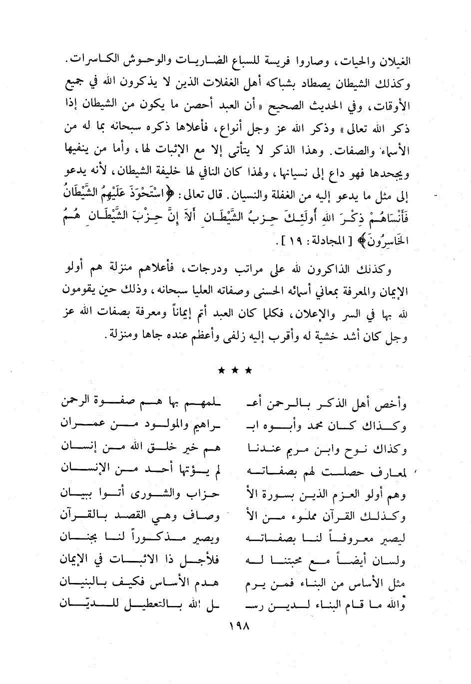 و كذلك الشيطان يصطاد بشباكه أهل الغفلات الذين لا يذكرون اللّه في جميع الأوقات، وفي الحديث الصحيح «أن العبد أحصن ما يكون من الشيطان إذا ذكر اللّه تعالى» وذكر اللّه عز وجل أنواع، فأعلاها ذكره سبحانه بما له من الأسماء والصفات. وهذا الذكر لا يتأتى إلا مع الإثبات لها، وأما من ينفيها ويجحدها فهو داع إلى نسيانها، ولهذا كان النافي لها خليفة الشيطان، لأنه يدعو إلى مثل ما يدعو إليه من الغفلة والنسيان. قال تعالى: اسْتَحْوَذَ عَلَيْهِمُ الشَّيْطانُ فَأَنْساهُمْ ذِكْرَ اللَّهِ أُولئِكَ حِزْبُ الشَّيْطانِ أَلا إِنَّ حِزْبَ الشَّيْطانِ هُمُ الْخاسِرُونَ [المجادلة: 19].