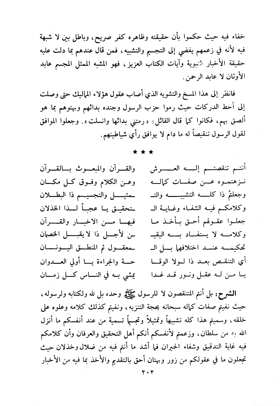 خفاء فيه حيث حكموا بأن حقيقته وظاهره كفر صريح، وباطل بين لا شبهة فيه لأنه في زعمهم يفضي إلى التجسيم والتشبيه، فمن قال عندهم بما دلت عليه حقيقة الأخبار النبوية وآيات الكتاب العزيز، فهو المشبه الممثل المجسم عابد الأوثان لا عابد الرحمن.