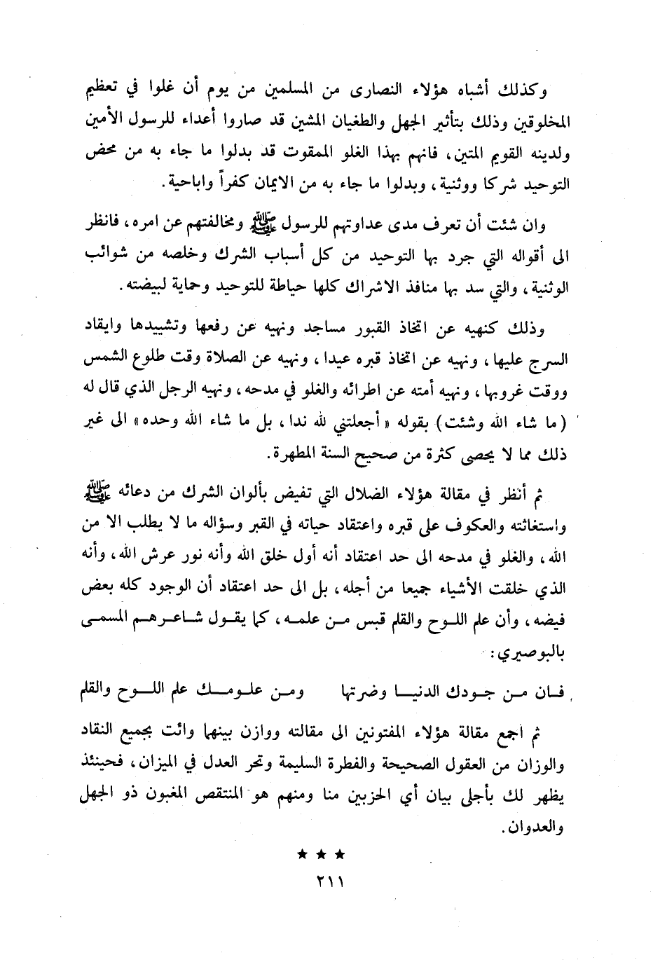 ثم أنظر في مقالة هؤلاء الضلال التي تفيض بألوان الشرك من دعائه صلّى اللّه عليه وسلّم واستغاثته والعكوف على قبره واعتقاد حياته في القبر وسؤاله ما لا يطلب الا من اللّه، والغلو في مدحه الى حد اعتقاد أنه أول خلق اللّه وأنه نور عرش اللّه، وأنه الذي خلقت الأشياء جميعا من أجله، بل الى حد اعتقاد أن الوجود كله بعض فيضه، وأن علم اللوح والقلم قبس من علمه، كما يقول شاعرهم المسمى بالبوصيري: