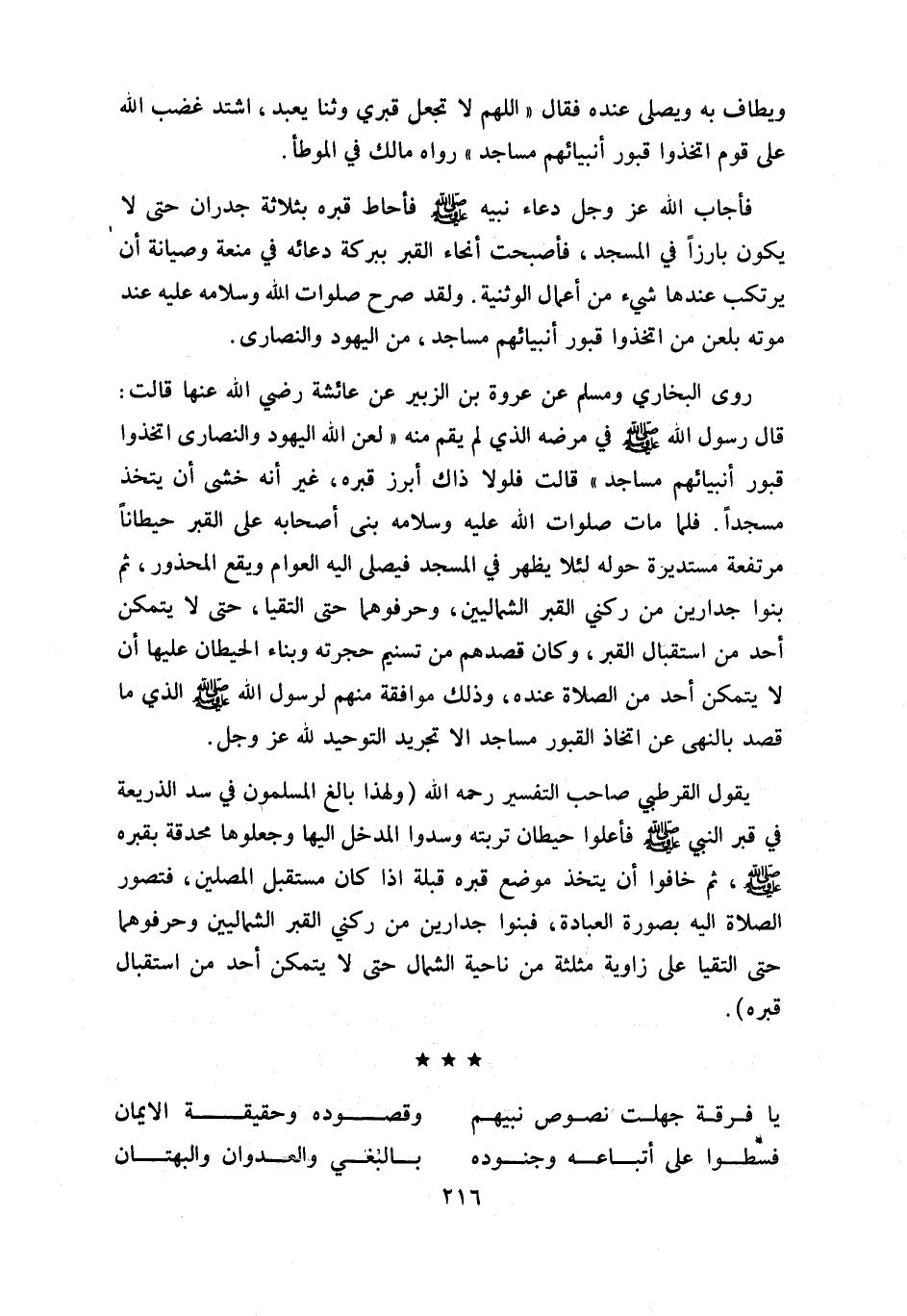 يقول القرطبي صاحب التفسير رحمه اللّه (و لهذا بالغ المسلمون في سد الذريعة في قبر النبي صلّى اللّه عليه وسلّم فأعلوا حيطان تربته وسدوا المدخل إليها وجعلوها محدقة بقبره صلّى اللّه عليه وسلّم، ثم خافوا أن يتخذ موضع قبره قبلة اذا كان مستقبل المصلين، فتصور الصلاة إليه بصورة العبادة، فبنوا جدارين من ركني القبر الشماليين وحرفوهما حتى التقيا على زاوية مثلثة من ناحية الشمال حتى لا يتمكن أحد من استقبال قبره).