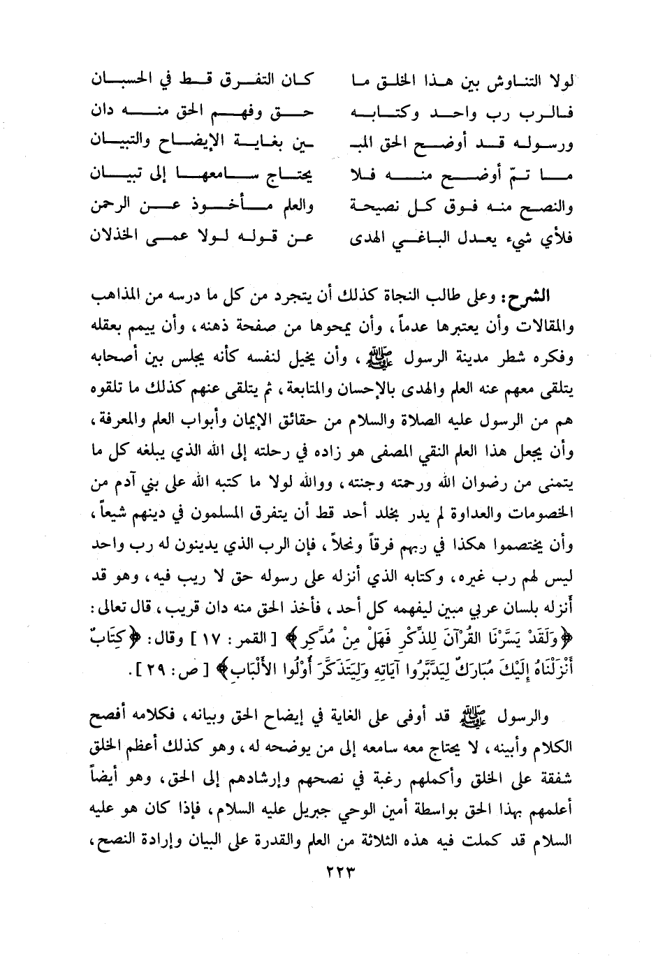 وعلى طالب النجاة كذلك أن يتجرد من كل ما درسه من المذاهب والمقالات وأن يعتبرها عدما، وأن يمحوها من صفحة ذهنه، وأن ييمم بعقله وفكره شطر مدينة الرسول صلّى اللّه عليه وسلّم، وأن يخيل لنفسه كأنه يجلس بين أصحابه يتلقى معهم عنه العلم والهدى بالإحسان والمتابعة، ثم يتلقى عنهم كذلك ما تلقوه هم من الرسول عليه الصلاة والسلام من حقائق الإيمان وأبواب العلم والمعرفة، وأن يجعل هذا العلم النقي المصفى هو زاده في رحلته إلى اللّه الذي يبلغه كل ما يتمنى من رضوان اللّه ورحمته وجنته، وو اللّه لو لا ما كتبه اللّه على بني آدم من الخصومات والعداوة لم يدر بخلد أحد قط أن يتفرق المسلمون في دينهم شيعا، وأن يختصموا هكذا في ربهم فرقا ونحلا، فإن الرب الذي يدينون له رب واحد ليس لهم رب غيره، وكتابه الذي أنزله على رسوله حق لا ريب فيه، وهو قد أنزله بلسان عربي مبين ليفهمه كل أحد، فأخذ الحق منه دان قريب، قال تعالى: