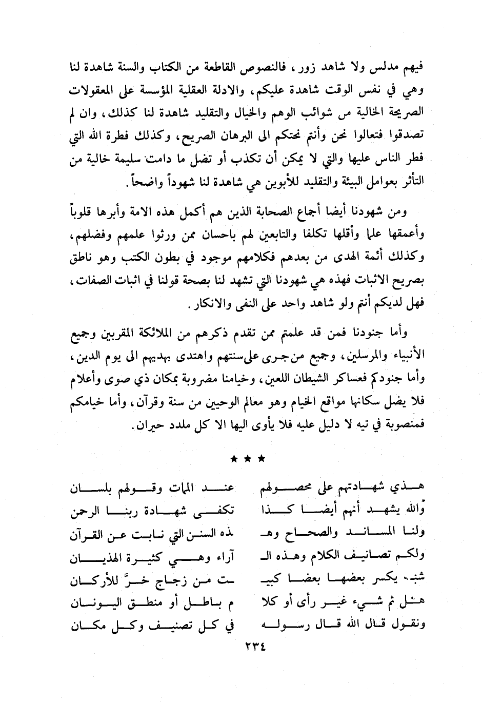 و من شهودنا أيضا إجماع الصحابة الذين هم أكمل هذه الامة وأبرها قلوبا وأعمقها علما وأقلها تكلفا والتابعين لهم باحسان ممن ورثوا علمهم وفضلهم، وكذلك أئمة الهدى من بعدهم فكلامهم موجود في بطون الكتب وهو ناطق بصريح الاثبات فهذه هي شهودنا التي تشهد لنا بصحة قولنا في اثبات الصفات، فهل لديكم أنتم ولو شاهد واحد على النفى والانكار.