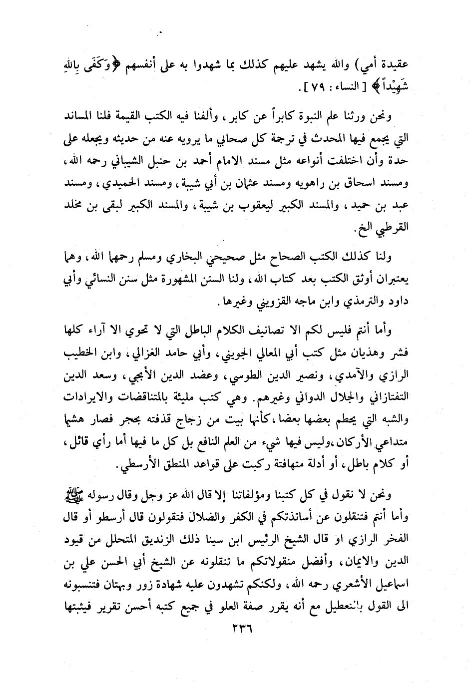 و أما أنتم فليس لكم الا تصانيف الكلام الباطل التي لا تحوي الا آراء كلها فشر وهذيان مثل كتب أبي المعالي الجويني، وأبي حامد الغزالي، وابن الخطيب الرازي والآمدي، ونصير الدين الطوسي، وعضد الدين الإبجي، وسعد الدين التفتازاني والجلال الدواني وغيرهم. وهي كتب مليئة بالمتناقضات والايرادات والشبه التي يحطم بعضها بعضا، كأنها بيت من زجاج قذفته بحجر فصار هشيما متداعي الأركان، وليس فيها شي ء من العلم النافع بل كل ما فيها أما رأي قائل، أو كلام باطل، أو أدلة متهافتة ركبت على قواعد المنطق الأرسطي.