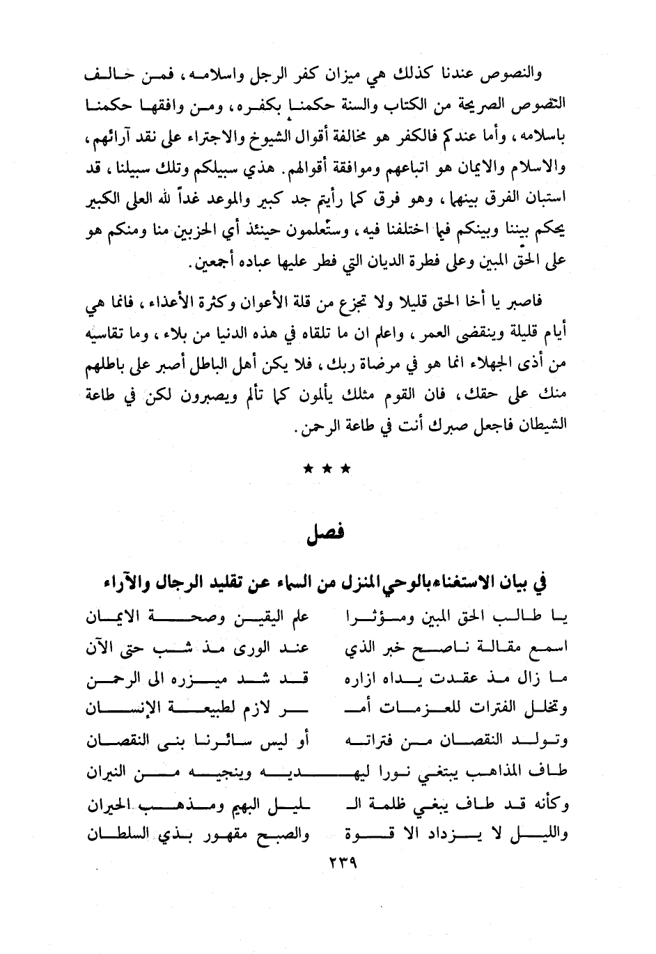 و النصوص عندنا كذلك هي ميزان كفر الرجل واسلامه، فمن خالف النصوص الصريحة من الكتاب والسنة حكمنا بكفره، ومن وافقها حكمنا باسلامه، وأما عندكم فالكفر هو مخالفة أقوال الشيوخ والاجتراء على نقد آرائهم، والاسلام والايمان هو اتباعهم وموافقة أقوالهم. هذي سبيلكم وتلك سبيلنا، قد استبان الفرق بينهما، وهو فرق كما رأيتم جد كبير والموعد غدا للّه العلى الكبير يحكم بيننا وبينكم فيما اختلفنا فيه، وستعلمون حينئذ أي الحزبين منا ومنكم هو على الحقّ المبين وعلى فطرة الديان التي فطر عليها عباده أجمعين.