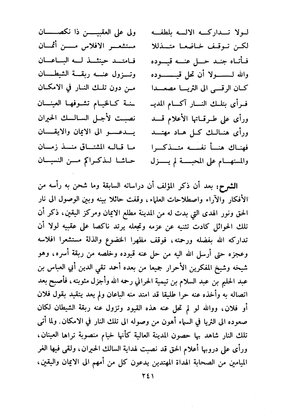 بعد أن ذكر المؤلف أن دراساته السابقة وما شحن به رأسه من الأفكار والآراء واصطلاحات العلماء، وقفت حائلا بينه وبين الوصول الى نار الحق ونور الهدى التي بدت له من المدينة مطلع الايمان ومركز اليقين، ذكر أن تلك الحوائل كادت تثنيه عن عزمه وتجعله يرتد ناكصا على عقبيه لو لا أن تداركه اللّه بفضله ورحمته، فوقف مظهرا الخضوع والذلة مستشعرا افلاسه وعجزه حتى أرسل اللّه إليه من حل عنه قيوده وخلصه من ربقة أسره، وهو شيخه وشيخ المفكرين الأحرار جميعا من بعده أحمد تقي الدين أبي العباس بن عبد الحليم بن عبد السلام بن تيمية الحراني رحمه اللّه وأجزل مثوبته، فأصبح بعد اتصاله به وأخذه عنه حرا طليقا قد امتد منه الباعان ولم يعد يتقيد بقول فلان أو فلان، وو اللّه لو لم تحل عنه هذه القيود وتزول عنه ربقة الشيطان لكان صعوده الى الثريا في السماء أهون من وصوله الى تلك النار في الامكان. ولما أتى تلك النار شاهد بها حصون المدينة العالية كأنها خيام منصوبة تراها العينان، ورأى على دروبها أعلام الحق قد نصبت لهداية السالك الحيران، ولقى فيها الغر الميامين من الصحابة الهداة المهتدين يدعون كل من أمهم الى الايمان واليقين،