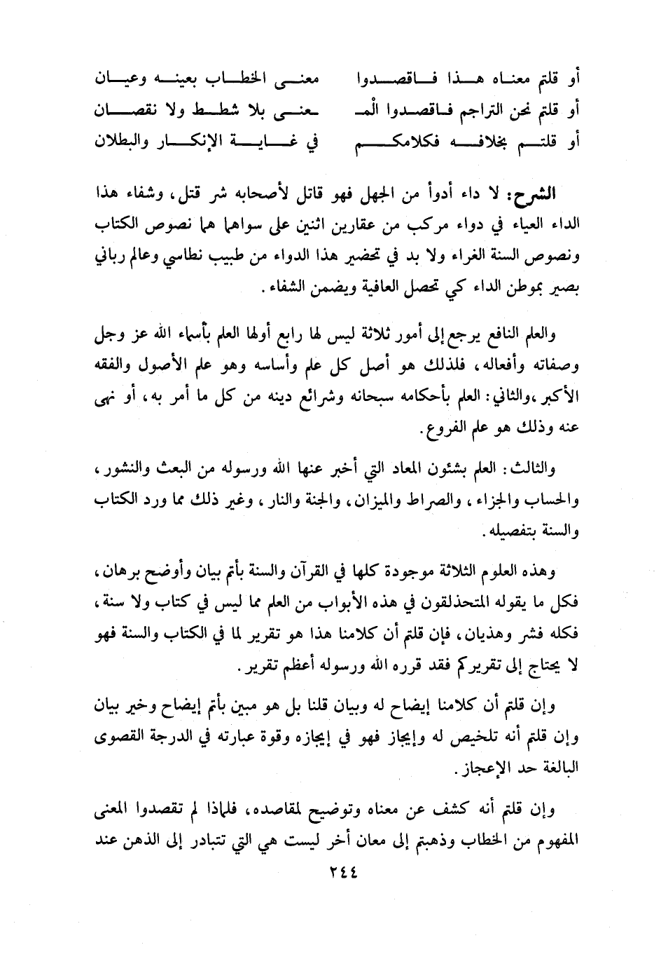 و هذه العلوم الثلاثة موجودة كلها في القرآن والسنة بأتم بيان وأوضح برهان، فكل ما يقوله المتحذلقون في هذه الأبواب من العلم مما ليس في كتاب ولا سنة، فكله فشر وهذيان، فإن قلتم أن كلامنا هذا هو تقرير لما في الكتاب والسنة فهو لا يحتاج إلى تقريركم فقد قرره اللّه ورسوله أعظم تقرير.