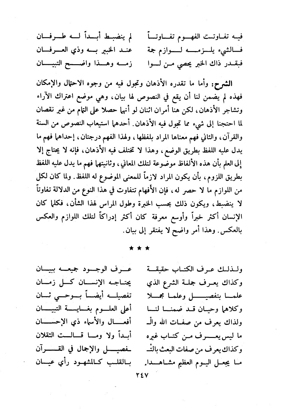 وأما ما تقدره الأذهان وتجول فيه من وجوه الاحتمال والإمكان فهذه لم يضمن لنا أن يقع في النصوص لها بيان، وهي موضع اعتراك الآراء وتشاجر الأذهان، لكن هنا أمران اثنان لو أنهما حصلا على التمام من غير نقصان لما احتجنا إلى شي ء مما تجول فيه الأذهان. أحدهما استيعاب النصوص من السنة والقرآن، والثاني فهم معناها المراد بلفظها، ولهذا الفهم درجتان، إحداهما فهم ما يدل عليه اللفظ بطريق الوضع، وهذا لا تختلف فيه الأذهان، فإنه لا يحتاج إلا إلى العلم بأن هذه الألفاظ موضوعة لتلك المعاني، وثانيتهما فهم ما يدل عليه اللفظ بطريق اللزوم، بأن يكون المراد لازما للمعنى الموضوع له اللفظ. ولما كان لكل من اللوازم ما لا حصر له، فإن الأفهام تتفاوت في هذا النوع من الدلالة تفاوتا لا ينضبط، ويكون ذلك بحسب الخبرة وطول المراس لهذا الشأن، فكلما كان الإنسان أكثر خبرا وأوسع معرفة كان أكثر إدراكا لتلك اللوازم والعكس بالعكس. وهذا أمر واضح لا يفتقر إلى بيان.