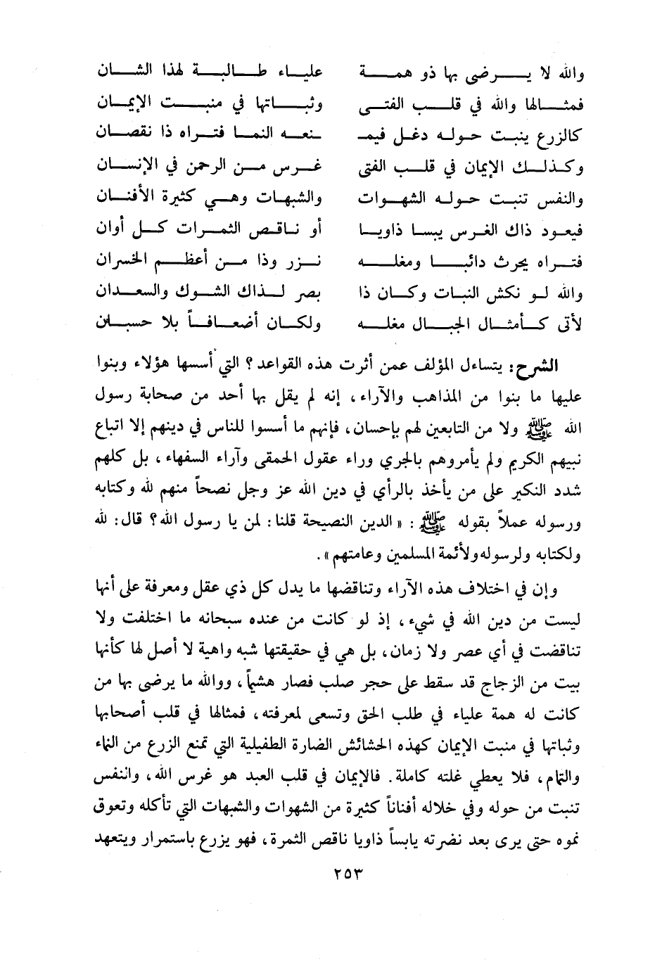 و إن في اختلاف هذه الآراء وتناقضها ما يدل كل ذي عقل ومعرفة على أنها ليست من دين اللّه في شي ء، إذ لو كانت من عنده سبحانه ما اختلفت ولا تناقضت في أي عصر ولا زمان، بل هي في حقيقتها شبه واهية لا أصل لها كأنها بيت من الزجاج قد سقط على حجر صلب فصار هشيما، وو اللّه ما يرضى بها من كانت له همة علياء في طلب الحق وتسعى لمعرفته، فمثالها في قلب أصحابها وثباتها في منبت الإيمان كهذه الحشائش الضارة الطفيلية التي تمنع الزرع من النماء والتمام، فلا يعطي غلته كاملة. فالإيمان في قلب العبد هو غرس اللّه، والنفس تنبت من حوله وفي خلاله أفنانا كثيرة من الشهوات والشبهات التي تأكله وتعوق نموه حتى يرى بعد نضرته يابسا ذاويا ناقص الثمرة، فهو يزرع باستمرار ويتعهد