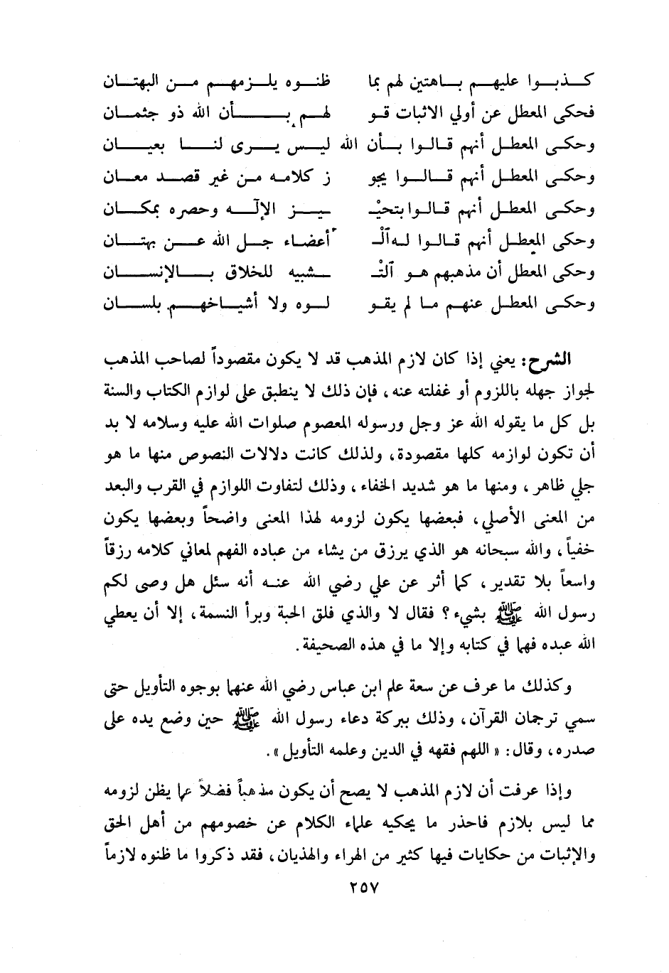 يعني إذا كان لازم المذهب قد لا يكون مقصودا لصاحب المذهب لجواز جهله باللزوم أو غفلته عنه، فإن ذلك لا ينطبق على لوازم الكتاب والسنة بل كل ما يقوله اللّه عز وجل ورسوله المعصوم صلوات اللّه عليه وسلامه لا بد أن تكون لوازمه كلها مقصودة، ولذلك كانت دلالات النصوص منها ما هو جلي ظاهر، ومنها ما هو شديد الخفاء، وذلك لتفاوت اللوازم في القرب والبعد من المعنى الأصلي، فبعضها يكون لزومه لهذا المعنى واضحا وبعضها يكون خفيا، واللّه سبحانه هو الذي يرزق من يشاء من عباده الفهم لمعاني كلامه رزقا واسعا بلا تقدير، كما أثر عن علي رضي اللّه عنه أنه سئل هل وصى لكم رسول اللّه صلّى اللّه عليه وسلّم بشي ء؟ فقال لا والذي فلق الحبة وبرأ النسمة، إلا أن يعطي اللّه عبده فهما في كتابه وإلا ما في هذه الصحيفة.