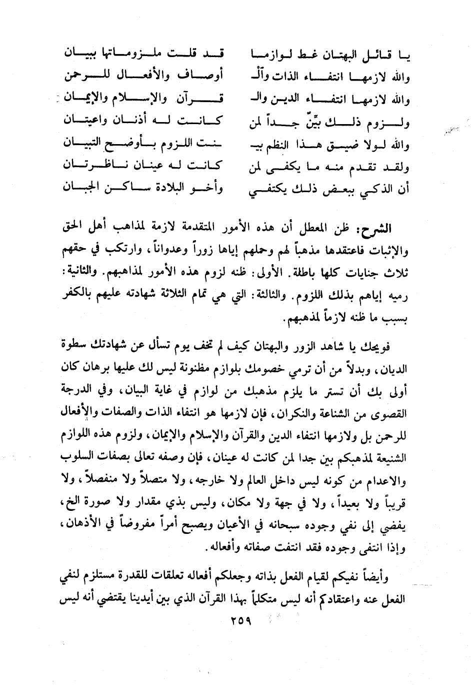 فويحك يا شاهد الزور والبهتان كيف لم تخف يوم تسأل عن شهادتك سطوة الديان، وبدلا من أن ترمي خصومك بلوازم مظنونة ليس لك عليها برهان كان أولى بك أن تستر ما يلزم مذهبك من لوازم في غاية البيان، وفي الدرجة القصوى من الشناعة والنكران، فإن لازمها هو انتفاء الذات والصفات والأفعال للرحمن بل ولازمها انتفاء الدين والقرآن والإسلام والإيمان، ولزوم هذه اللوازم الشنيعة لمذهبكم بين جدا لمن كانت له عينان، فإن وصفه تعالى بصفات السلوب والاعدام من كونه ليس داخل العالم ولا خارجه، ولا متصلا ولا منفصلا، ولا قريبا ولا بعيدا، ولا في جهة ولا مكان، وليس بذي مقدار ولا صورة الخ، يفضي إلى نفي وجوده سبحانه في الأعيان ويصبح أمرا مفروضا في الأذهان، وإذا انتفى وجوده فقد انتفت صفاته وأفعاله.