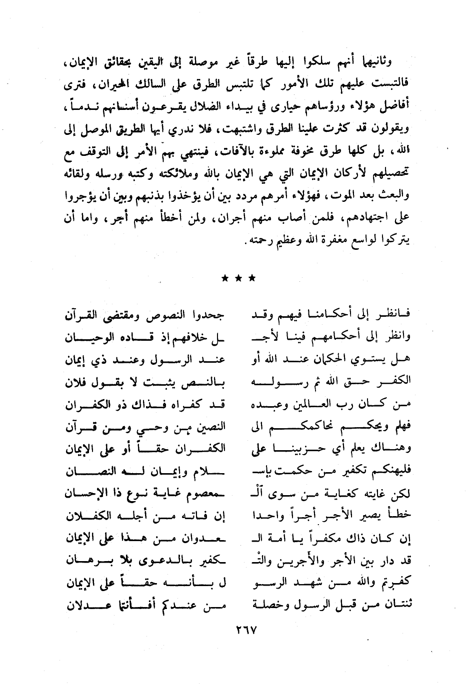 و ثانيهما أنهم سلكوا إليها طرقا غير موصلة إلى اليقين بحقائق الإيمان، فالتبست عليهم تلك الأمور كما تلتبس الطرق على السالك الحيران، فترى أفاضل هؤلاء ورؤساءهم حيارى في بيداء الضلال يقرعون أسنانهم ندما، ويقولون قد كثرت علينا الطرق واشتبهت، فلا ندري أيها الطريق الموصل إلى اللّه، بل كلها طرق مخوفة مملوءة بالآفات، فينتهي بهم الأمر إلى التوقف مع تحصيلهم لأركان الإيمان التي هي الإيمان باللّه وملائكته وكتبه ورسله ولقائه والبعث بعد الموت، فهؤلاء أمرهم مردد بين أن يؤخذوا بذنبهم وبين أن يؤجروا على اجتهادهم، فلمن أصاب منهم أجران، ولمن أخطأ منهم أجر، واما أن يتركوا لواسع مغفرة اللّه وعظيم رحمته.