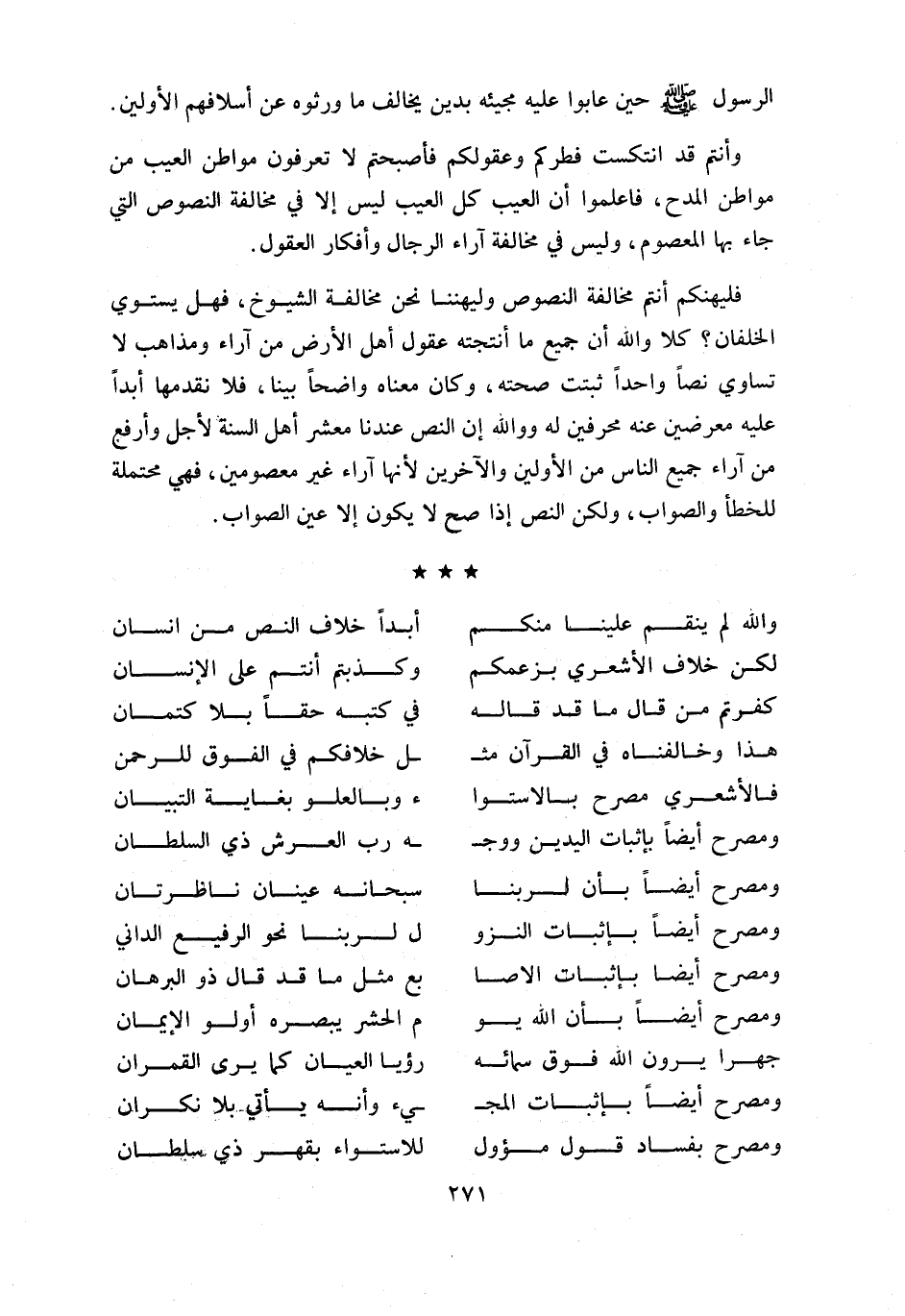 فليهنكم أنتم مخالفة النصوص وليهننا نحن مخالفة الشيوخ، فهل يستوي الخلفان؟ كلا واللّه أن جميع ما أنتجته عقول أهل الأرض من آراء ومذاهب لا تساوي نصا واحدا تثبت صحته، وكان معناه واضحا بينا، فلا نقدمها أبدا عليه معرضين عنه محرفين له وو اللّه إن النص عندنا معشر أهل السنة لأجل وأرفع من آراء جميع الناس من الأولين والآخرين لأنها آراء غير معصومين، فهي محتملة للخطأ والصواب، ولكن النص إذا صح لا يكون إلا عين الصواب.