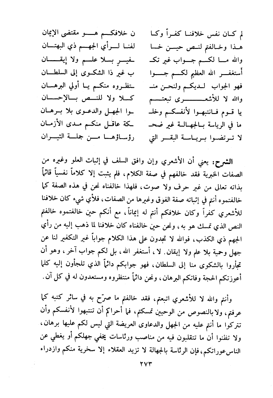 يعني أن الأشعري وإن وافق السلف في إثبات العلو وغيره من الصفات الخبرية فقد خالفهم في صفة الكلام، فلم يثبت إلا كلاما نفسيا قائما بذاته تعالى من غير حرف ولا صوت، فلهذا خالفناه نحن في هذه الصفة كما خالفتموه أنتم في إثباته صفة الفوق وغيرها من الصفات، فلأي شي ء كان خلافنا للأشعري كفرا وكان خلافكم أنتم له إيمانا، مع أنكم حين خالفتموه خالفتم النص الذي تمسك هو به، ونحن حين خالفناه كان خلافنا لما ذهب إليه من رأي الجهم ذي الكذب، فو اللّه لا تجدون على هذا الكلام جوابا غير التكفير لنا عن جهل وحمية بلا علم ولا إيقان. لا، أستغفر اللّه، بل لكم جواب آخر، وهو أن تجأروا بالشكوى منا إلى السلطان، فهو جوابكم دائما الذي تلجئون إليه كلما أعوزتكم الحجة وفاتكم البرهان، ونحن دائما منتظروه ومستعدون له في كل آن.