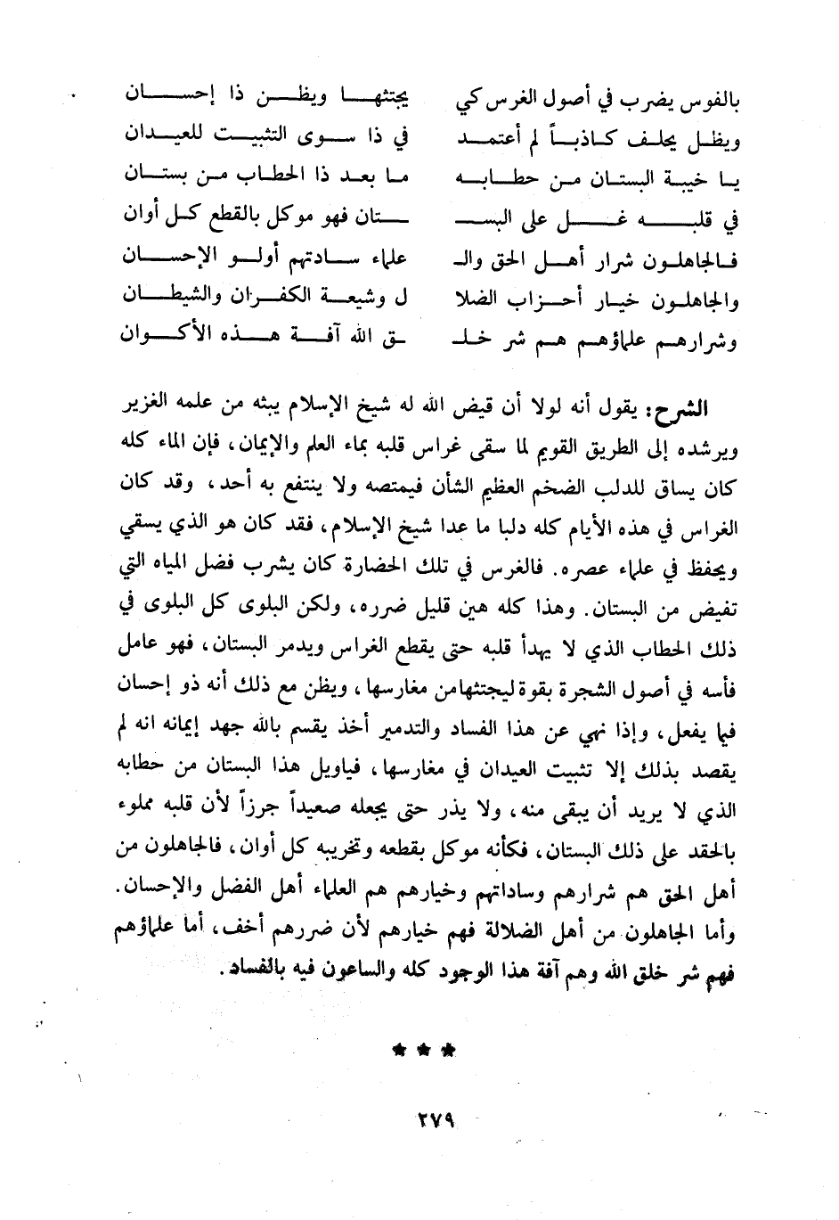 يقول أنه لو لا أن قيض اللّه له شيخ الإسلام يبثه من علمه الغزير ويرشده إلى الطريق القويم لما سقى غراس قلبه بماء العلم والإيمان، فإن الماء كله كان يساق للدلب الضخم العظيم الشأن فيمتصه ولا ينتفع به أحد، وقد كان الغراس في هذه الأيام كله دلبا ما عدا شيخ الإسلام، فقد كان هو الذي يسقي ويحفظ في علماء عصره. فالغرس في تلك الحضارة كان يشرب فضل المياه التي تفيض من البستان. وهذا كله هين قليل ضرره، ولكن البلوى كل البلوى في ذلك الحطاب الذي لا يهدأ قلبه حتى يقطع الغراس ويدمر البستان، فهو عامل فأسه في أصول الشجرة بقوة ليجتثها من مغارسها، ويظن مع ذلك أنه ذو إحسان فيما يفعل، وإذا نهي عن هذا الفساد والتدمير أخذ يقسم باللّه جهد إيمانه انه لم يقصد بذلك إلا تثبيت العيدان في مغارسها، فيا ويل هذا البستان من حطابه الذي لا يريد أن يبقى منه، ولا يذر حتى يجعله صعيدا جرزا لأن قلبه مملوء بالحقد على ذلك البستان، فكأنه موكل بقطعه وتخريبه كل أوان، فالجاهلون من أهل الحق هم شرارهم وساداتهم وخيارهم هم العلماء أهل الفضل والإحسان.