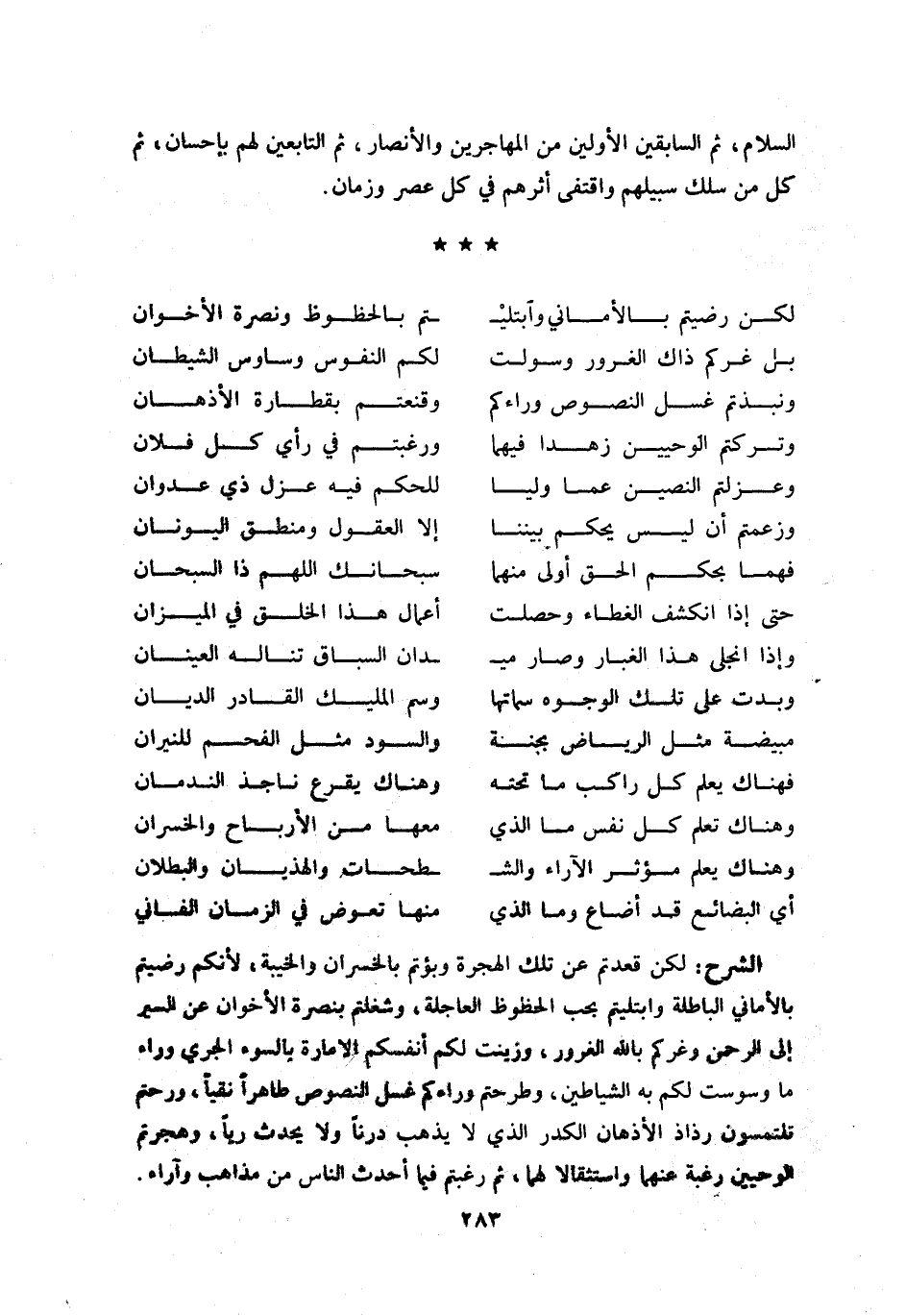 لكن قعدتم عن تلك الهجرة وبؤتم بالخسران والخيبة، لأنكم رضيتم بالأماني الباطلة وابتليتم بحب الحظوظ العاجلة، وشغلتم بنصرة الأخوان عن السير إلى الرحمن وغركم باللّه الغرور، وزينت لكم أنفسكم الامارة بالسوء الجري وراء ما وسوست لكم به الشياطين، وطرحتم وراءكم غسل النصوص طاهرا نقيا، ورحتم تلتمسون رذاذ الأذهان الكدر الذي لا يذهب درنا ولا يحدث ريا، وهجرتم الوحيين رغبة عنهما واستثقالا لهما، ثم رغبتم فيما أحدث الناس من مذاهب وآراء.