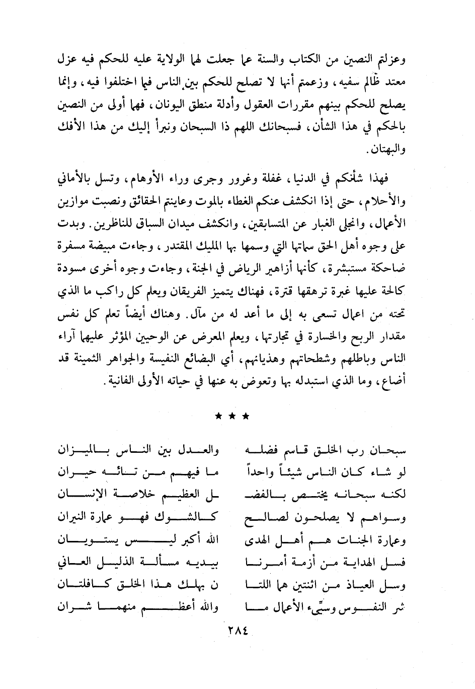 فهذا شأنكم في الدنيا، غفلة وغرور وجرى وراء الأوهام، وتسل بالأماني والأحلام، حتى إذا انكشف عنكم الغطاء بالموت وعاينتم الحقائق ونصبت موازين الأعمال، وانجلى الغبار عن المتسابقين، وانكشف ميدان السباق للناظرين. وبدت على وجوه أهل الحق سماتها التي وسمها بها المليك المقتدر، وجاءت مبيضة مسفرة ضاحكة مستبشرة، كأنها أزاهير الرياض في الجنة، وجاءت وجوه أخرى مسودة كالحة عليها غبرة ترهقها قترة، فهناك يتميز الفريقان ويعلم كل راكب ما الذي تحته من اعمال تسعى به إلى ما أعد له من مآل. وهناك أيضا تعلم كل نفس مقدار الربح والخسارة في تجارتها، ويعلم المعرض عن الوحيين المؤثر عليهما آراء الناس وباطلهم وشطحاتهم وهذيانهم، أي البضائع النفيسة والجواهر الثمينة قد أضاع، وما الذي استبدله بها وتعوض به عنها في حياته الأولى الفانية.