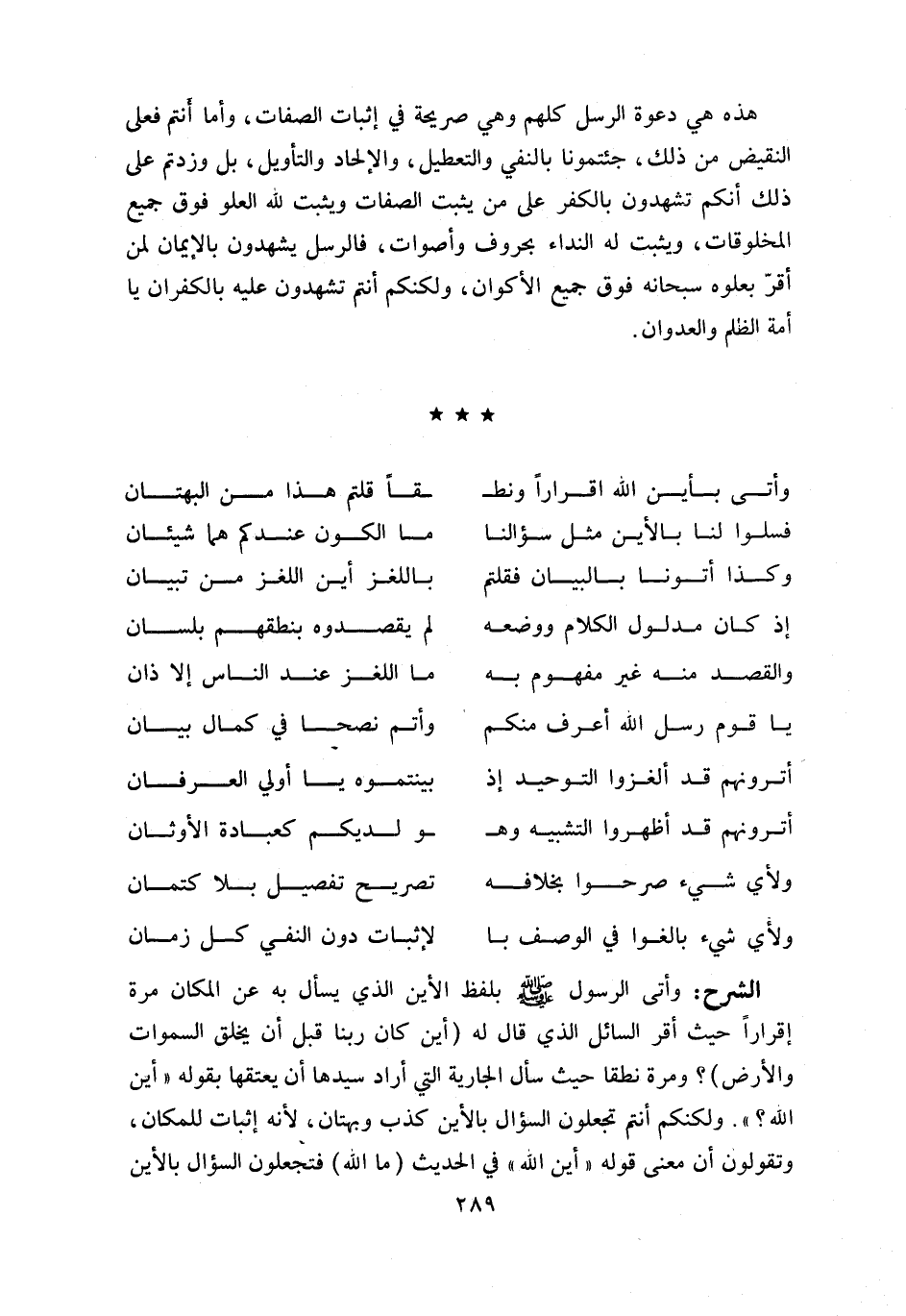وأتى الرسول صلّى اللّه عليه وسلّم بلفظ الأين الذي يسأل به عن المكان مرة إقرارا حيث أقر السائل الذي قال له (أين كان ربنا قبل أن يخلق السموات والأرض)؟ ومرة نطقا حيث سأل الجارية التي أراد سيدها أن يعتقها بقوله «أين اللّه؟». ولكنكم أنتم تجعلون السؤال بالأين كذب وبهتان، لأنه إثبات للمكان، وتقولون أن معنى قوله «أين اللّه» في الحديث (ما اللّه) فتجعلون السؤال بالأين