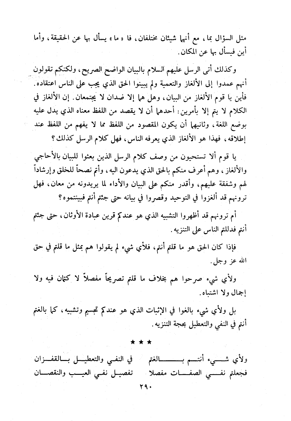 فأين يا قوم الألغاز من البيان، وهل هما إلا ضدان لا يجتمعان. إن الألغاز في الكلام لا يتم إلا بأمرين: أحدهما أن لا يقصد من اللفظ معناه الذي يدل عليه بوضع اللغة، وثانيهما أن يكون المقصود من اللفظ مما لا يفهم من اللفظ عند إطلاقه، فهذا هو الألغاز الذي يعرفه الناس، فهل كلام الرسل كذلك؟
