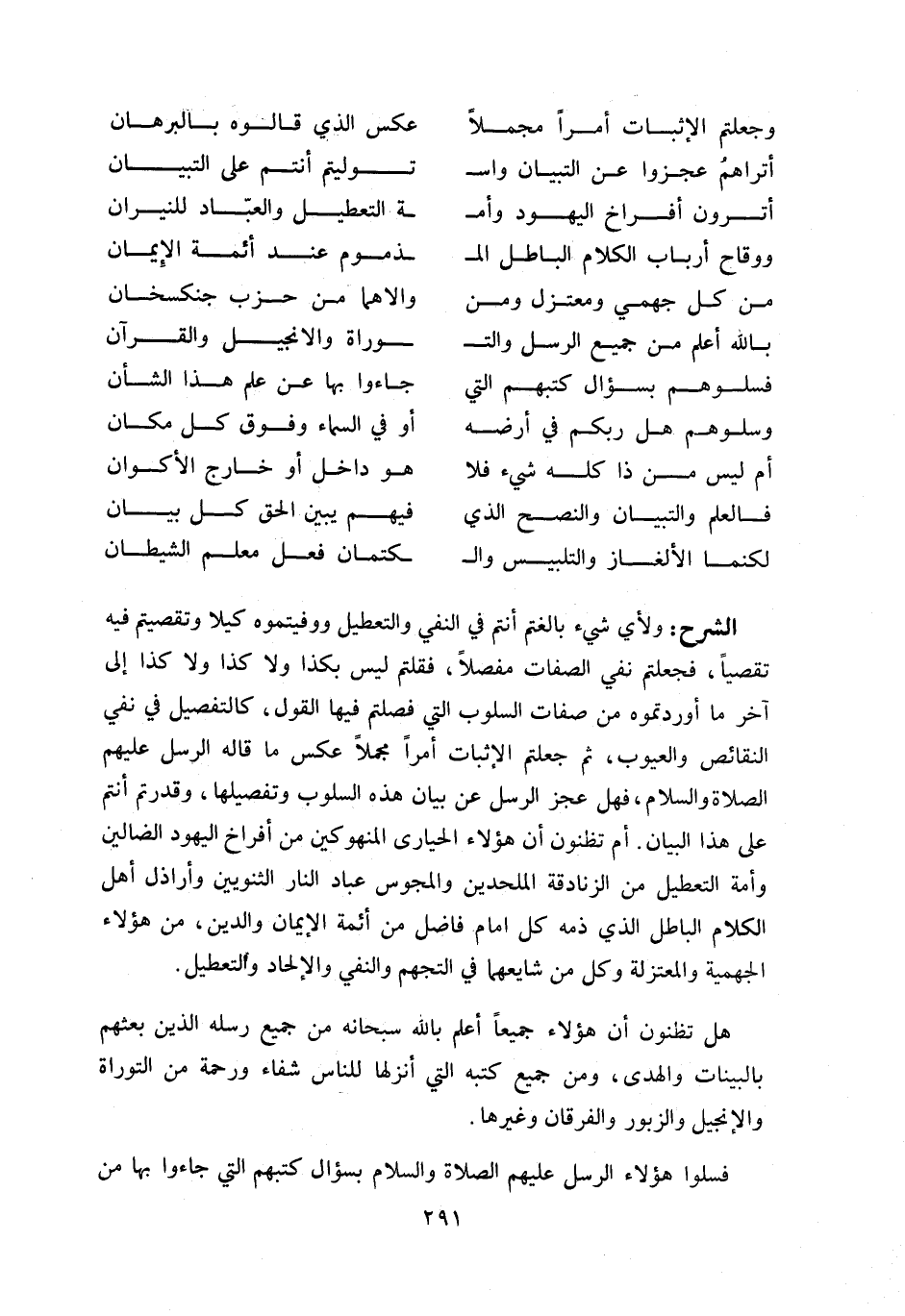 ولأي شي ء بالغتم أنتم في النفي والتعطيل ووفيتموه كيلا وتقصيتم فيه تقصيا، فجعلتم نفي الصفات مفصلا، فقلتم ليس بكذا ولا كذا ولا كذا إلى آخر ما أوردتموه من صفات السلوب التي فصلتم فيها القول، كالتفصيل في نفي النقائص والعيوب، ثم جعلتم الإثبات أمرا مجملا عكس ما قاله الرسل عليهم الصلاة والسلام، فهل عجز الرسل عن بيان هذه السلوب وتفصيلها، وقدرتم أنتم على هذا البيان. أم تظنون أن هؤلاء الحيارى المنهوكين من أفراخ اليهود الضالين وأمة التعطيل من الزنادقة الملحدين والمجوس عباد النار الثنويين وأراذل أهل الكلام الباطل الذي ذمه كل امام فاضل من أئمة الإيمان والدين، من هؤلاء الجهمية والمعتزلة وكل من شايعهما في التجهم والنفي والإلحاد والتعطيل.