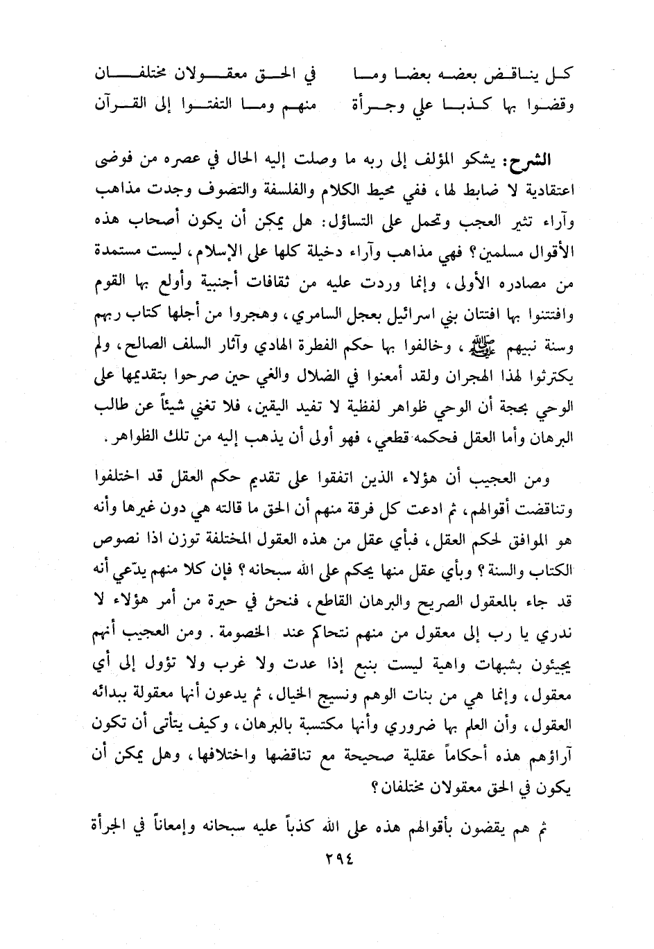 يشكو المؤلف إلى ربه ما وصلت إليه الحال في عصره من فوضى اعتقادية لا ضابط لها، ففي محيط الكلام والفلسفة والتصوف وجدت مذاهب وآراء تثير العجب وتحمل على التساؤل: هل يمكن أن يكون أصحاب هذه الأقوال مسلمين؟ فهي مذاهب وآراء دخيلة كلها على الإسلام، ليست مستمدة من مصادره الأولى، وإنما وردت عليه من ثقافات أجنبية وأولع بها القوم وافتتنوا بها افتتان بني اسرائيل بعجل السامري، وهجروا من أجلها كتاب ربهم وسنة نبيهم صلّى اللّه عليه وسلّم، وخالفوا بها حكم الفطرة الهادي وآثار السلف الصالح، ولم يكترثوا لهذا الهجران ولقد أمعنوا في الضلال والغي حين صرحوا بتقديمها على الوحي بحجة أن الوحي ظواهر لفظية لا تفيد اليقين، فلا تغني شيئا عن طالب البرهان وأما العقل فحكمه قطعي، فهو أولى أن يذهب إليه من تلك الظواهر.
